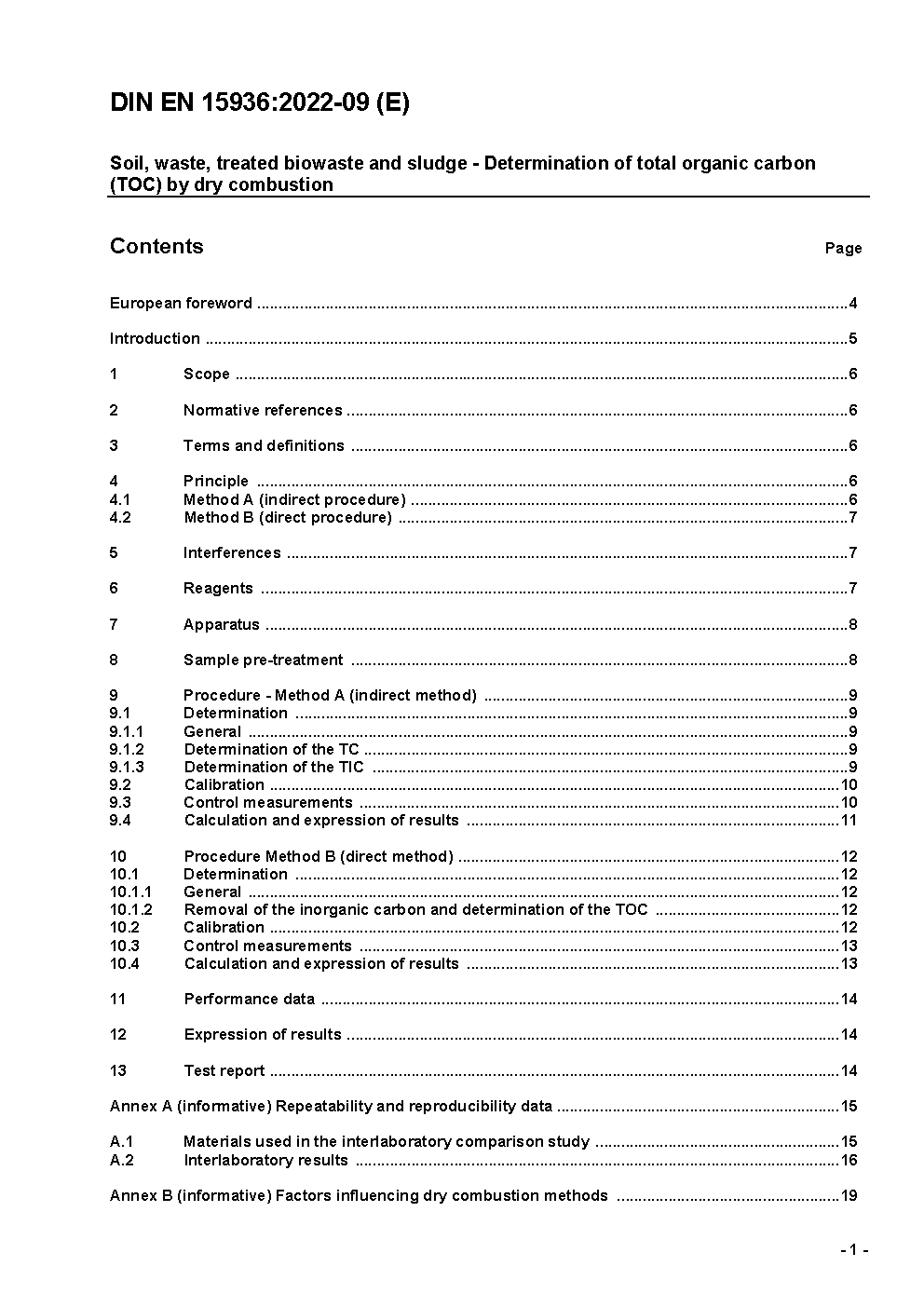 Sludge, treated biowaste, soil and waste - Determination of total organic carbon (TOC) by dry combustion; German version EN 15936:2012