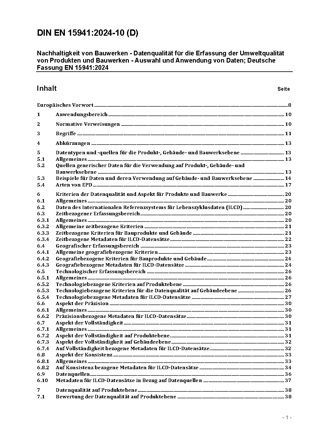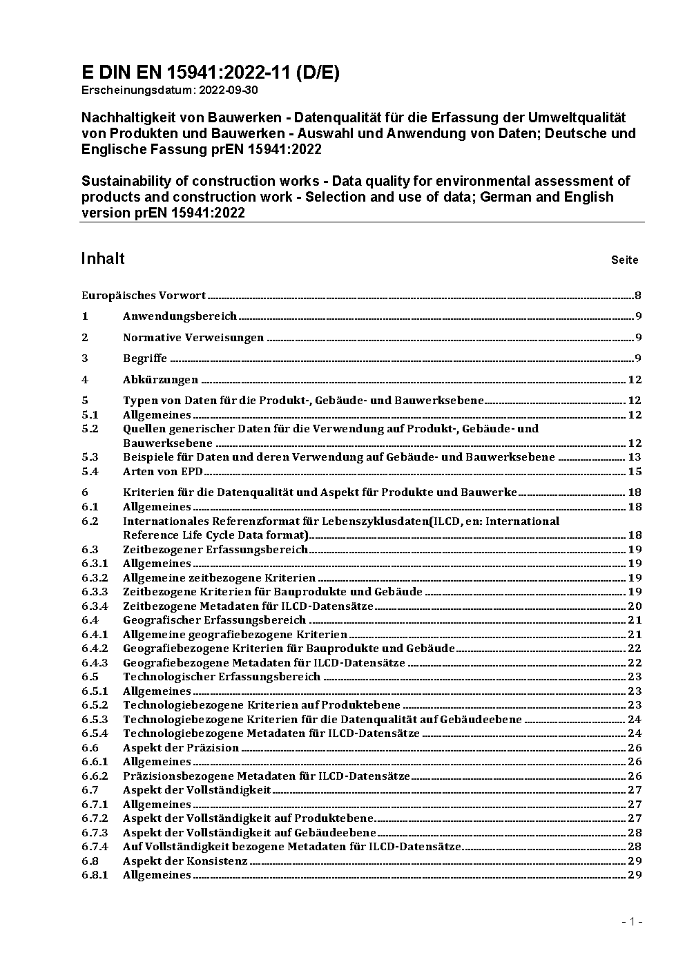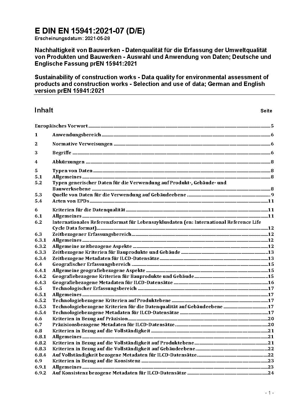 Sustainability of construction works - Data quality for environmental assessment of products and construction works - Selection and use of data; German and English version prEN 15941:2021