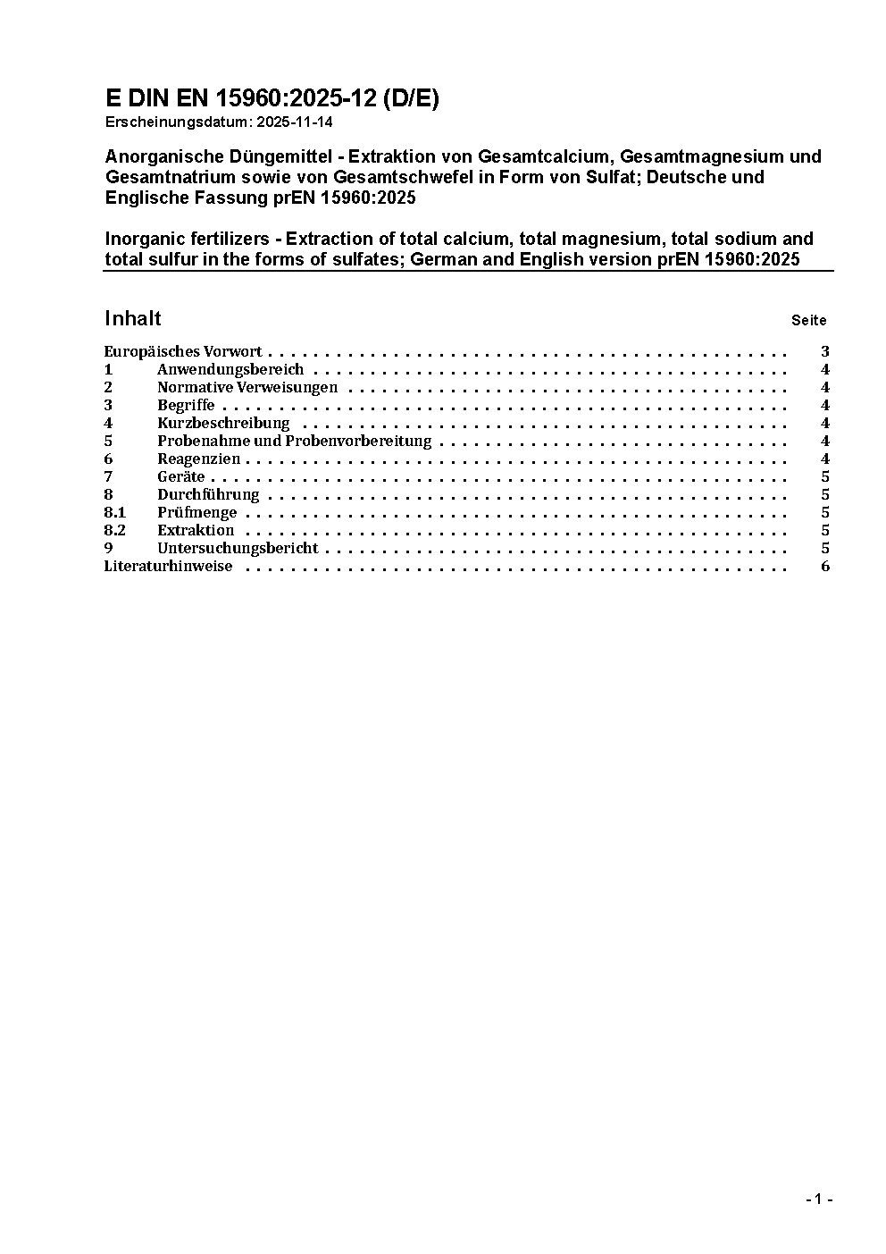 Düngemittel - Extraktion von Gesamtcalcium, Gesamtmagnesium und Gesamtnatrium sowie von Gesamtschwefel in Form von Sulfat; Deutsche Fassung FprEN 15960:2011