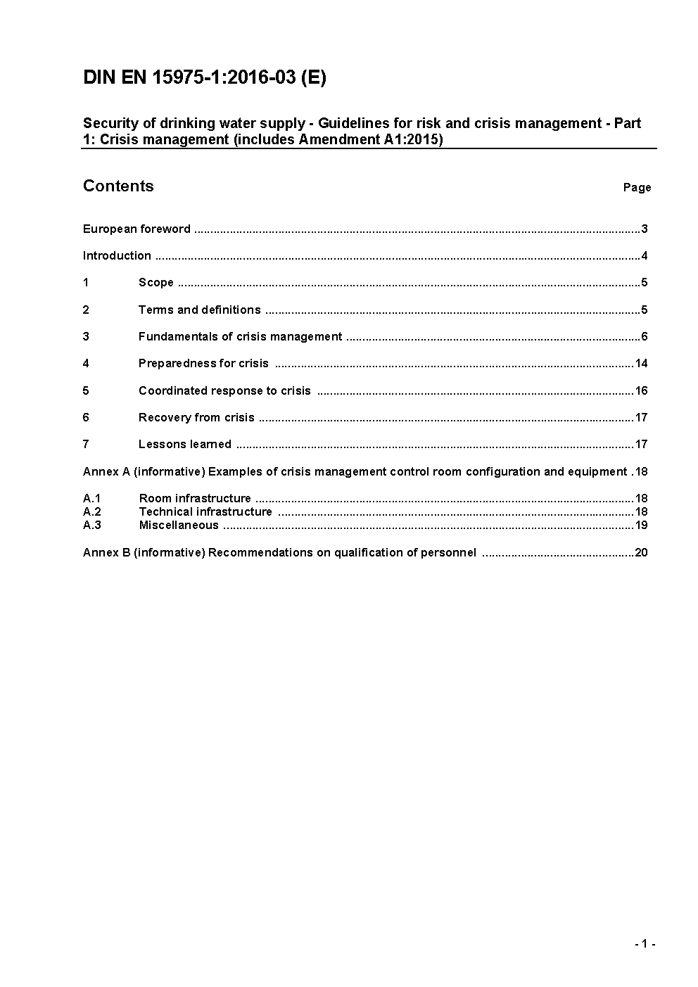 Sicherheit der Trinkwasserversorgung - Leitlinien für das Risiko- und Krisenmanagement - Teil 1: Krisenmanagement; Deutsche Fassung EN 15975-1:2011
