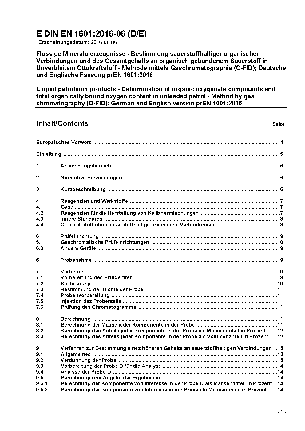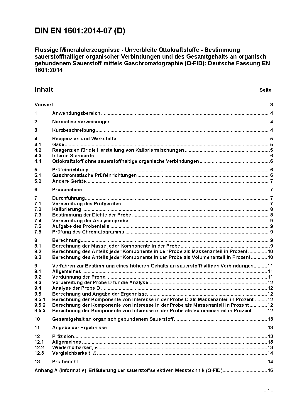 Flüssige Mineralölerzeugnisse - Unverbleite Ottokraftstoffe - Bestimmung sauerstoffhaltiger organischer Verbindungen und des Gesamtgehalts an organisch gebundenem Sauerstoff mittels Gaschromatographie (O-FID); Deutsche Fassung EN 1601:1997