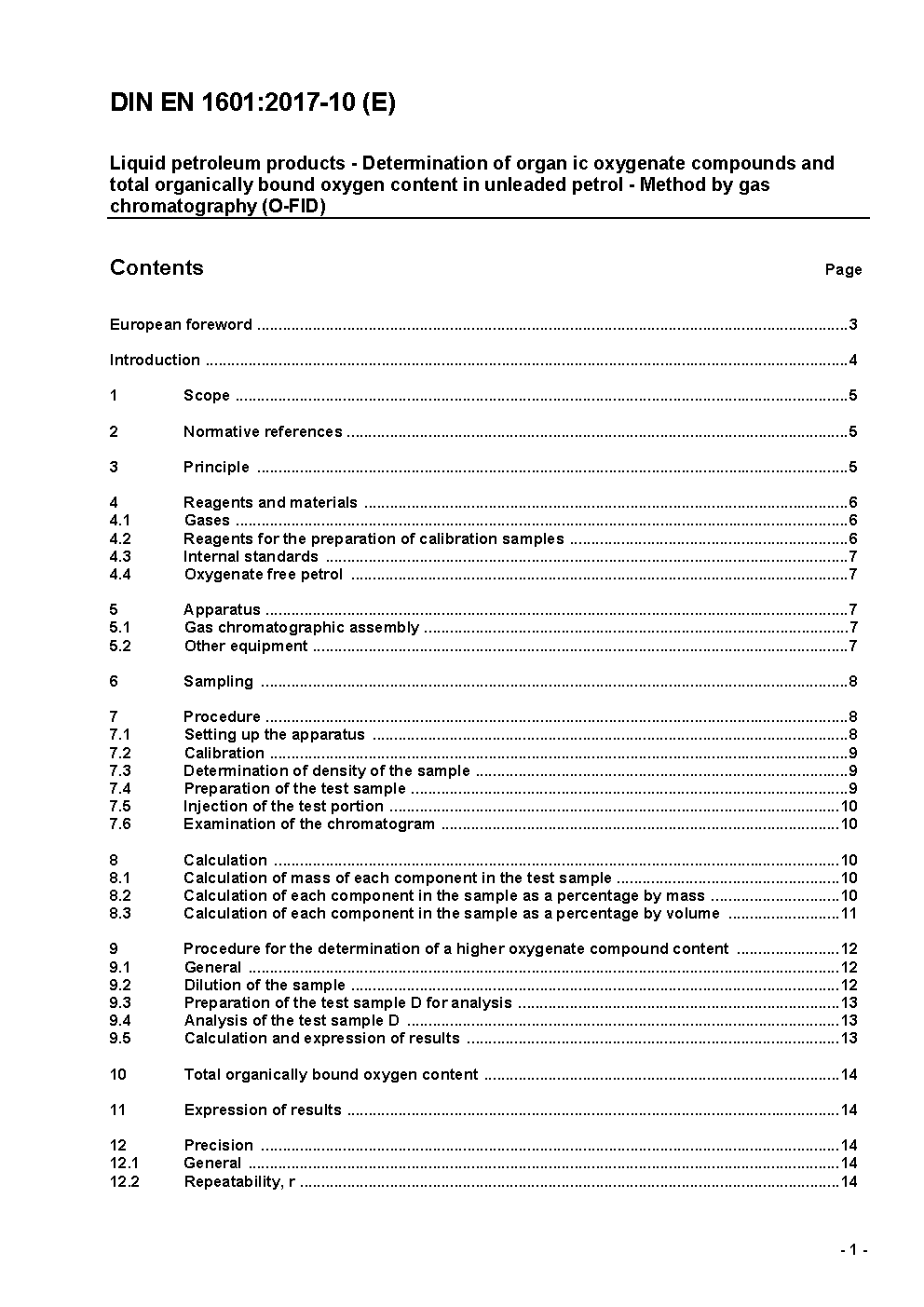 Liquid petroleum products - Unleaded petrol - Determination of organic oxygenate compounds and total organically bound oxygen content by gas chromatography (O-FID); German version EN 1601:1997