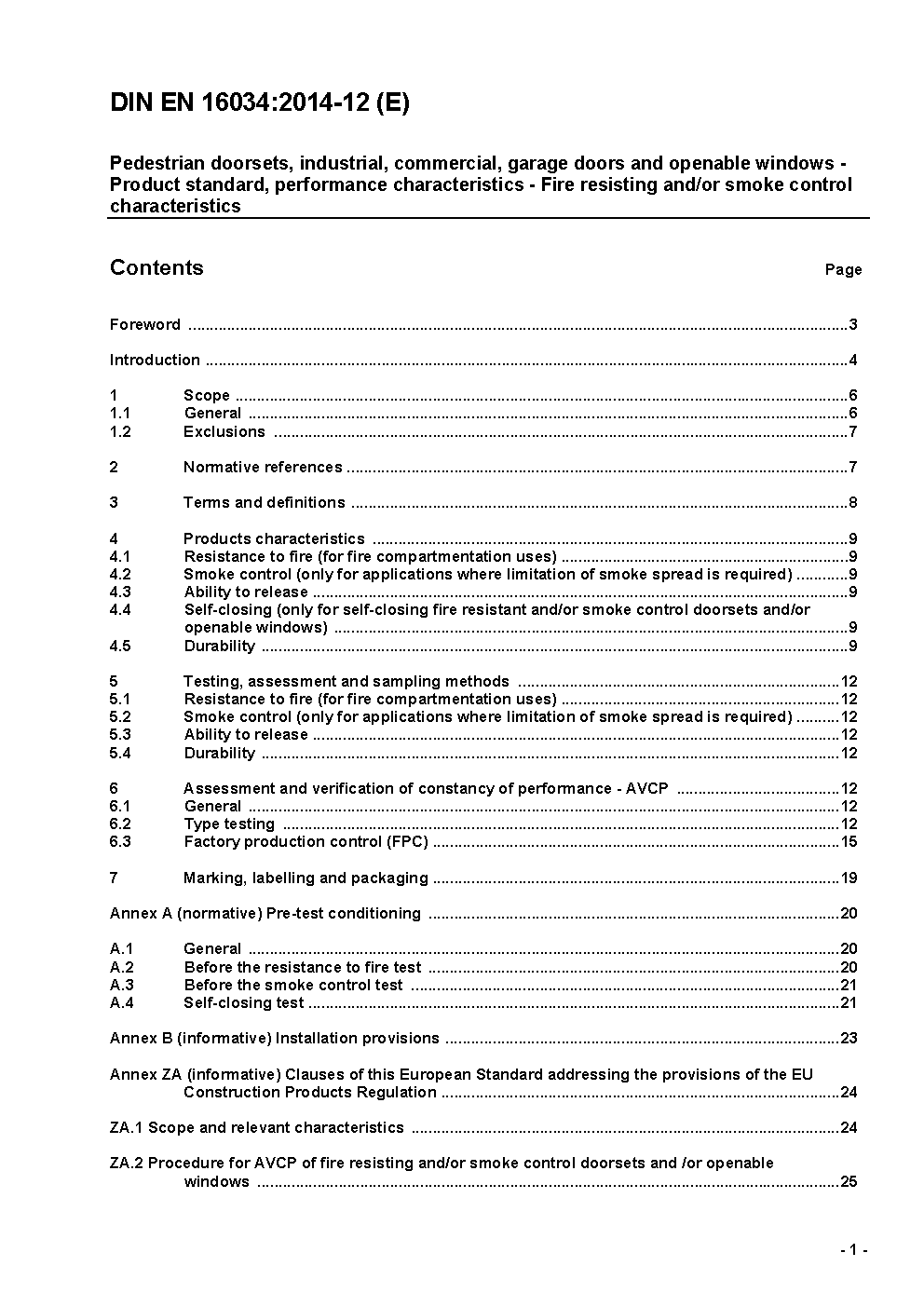 Pedestrian doorsets, industrial, commercial, garage doors and openable windows - Product standard, performance characteristics - Fire resistance and/or smoke control characteristics; German version FprEN 16034:2014