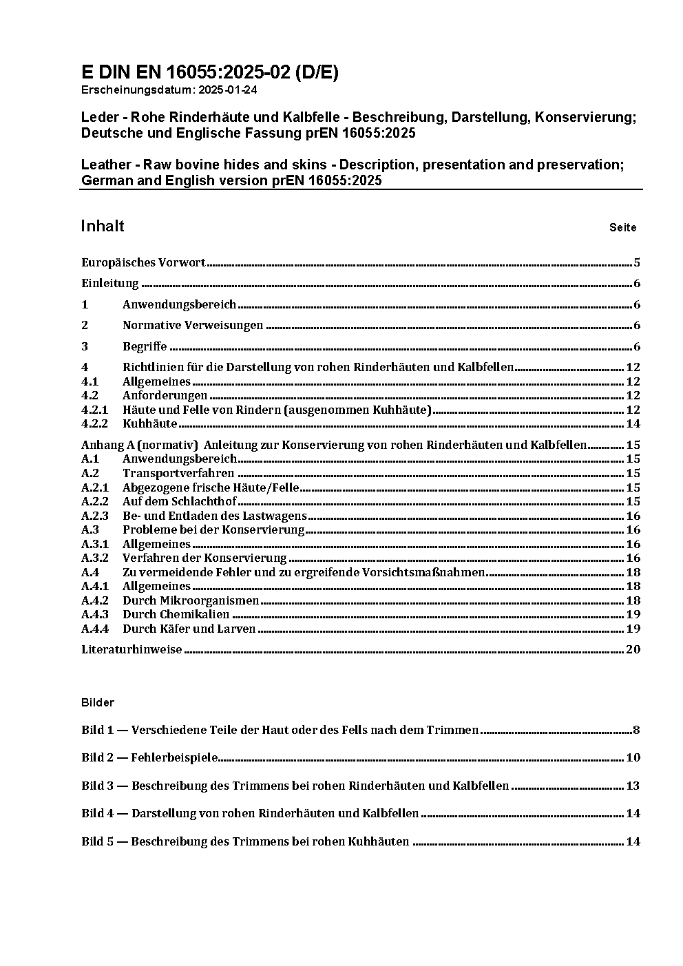 Leder - Rohe Rinderhäute und Kalbfelle - Beschreibung, Darstellung, Konservierung; Deutsche und Englische Fassung prEN 16055:2025