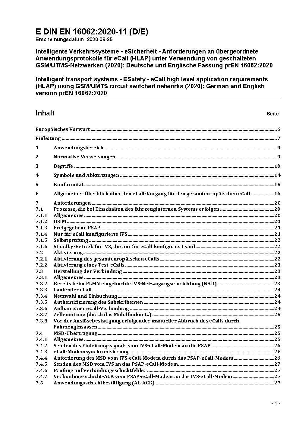 Intelligente Verkehrssysteme - eSicherheit - Anforderungen an übergeordnete Anwendungsprotokolle für eCall (HLAP) unter Verwendung von leitungsvermittelnden GSM/UMTS-Netzwerken; Deutsche Fassung EN 16062:2023