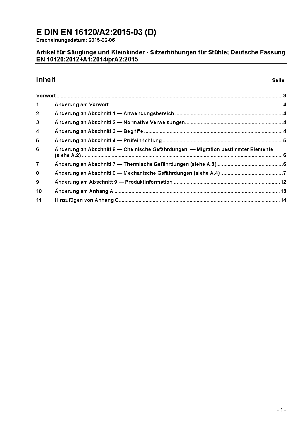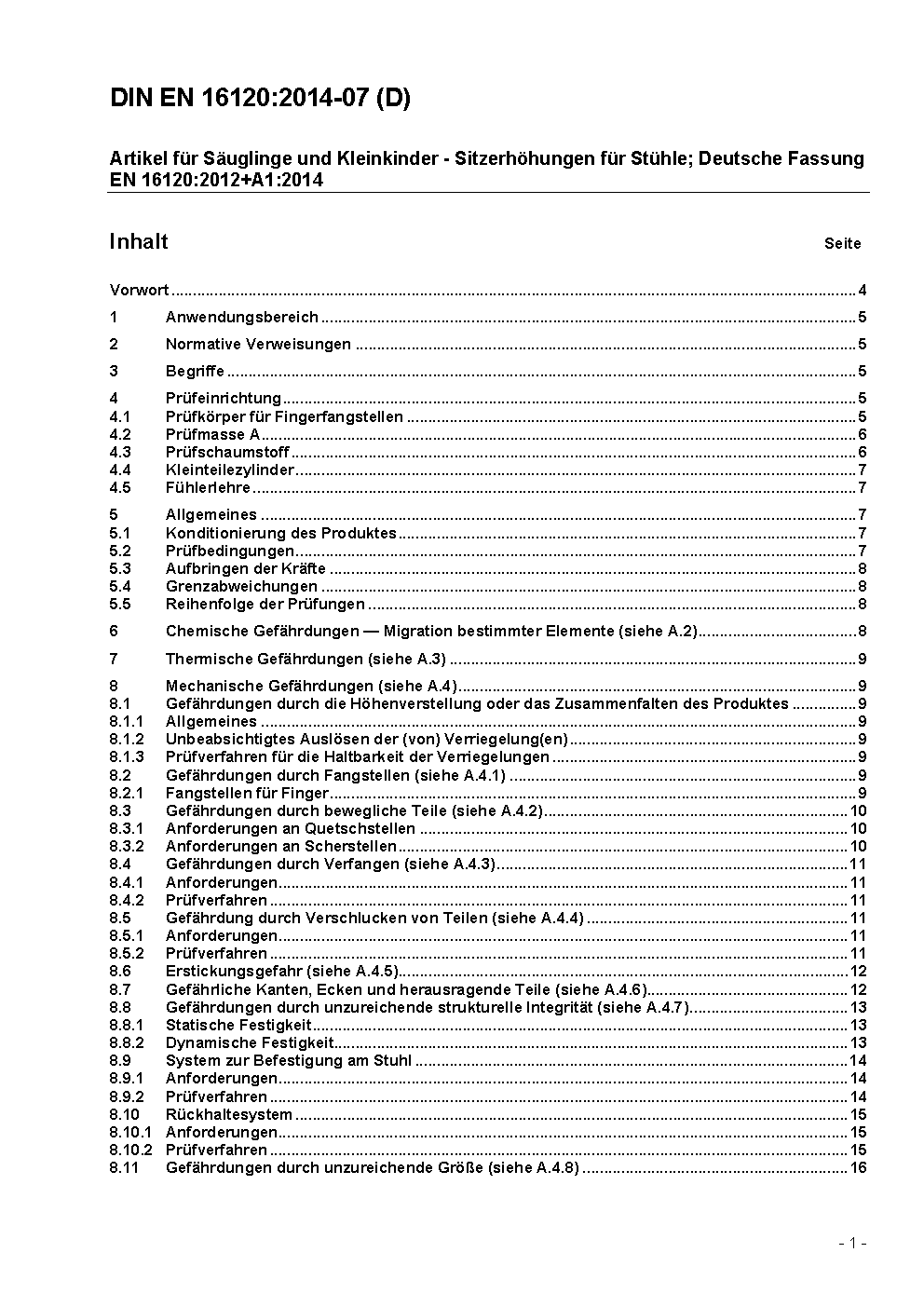 Artikel für Säuglinge und Kleinkinder - Sitzerhöhungen für Stühle; Deutsche Fassung EN 16120:2012+A1:2014