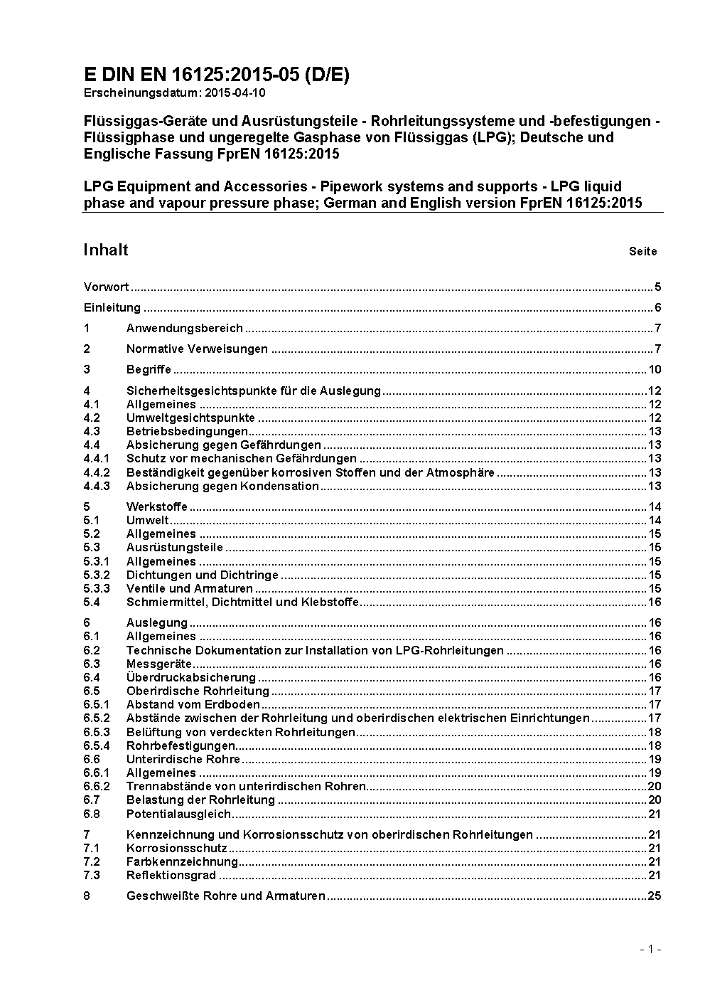LPG Equipment and Accessories - Pipework systems and supports - LPG liquid phase and vapour pressure phase; German version EN 16125:2015