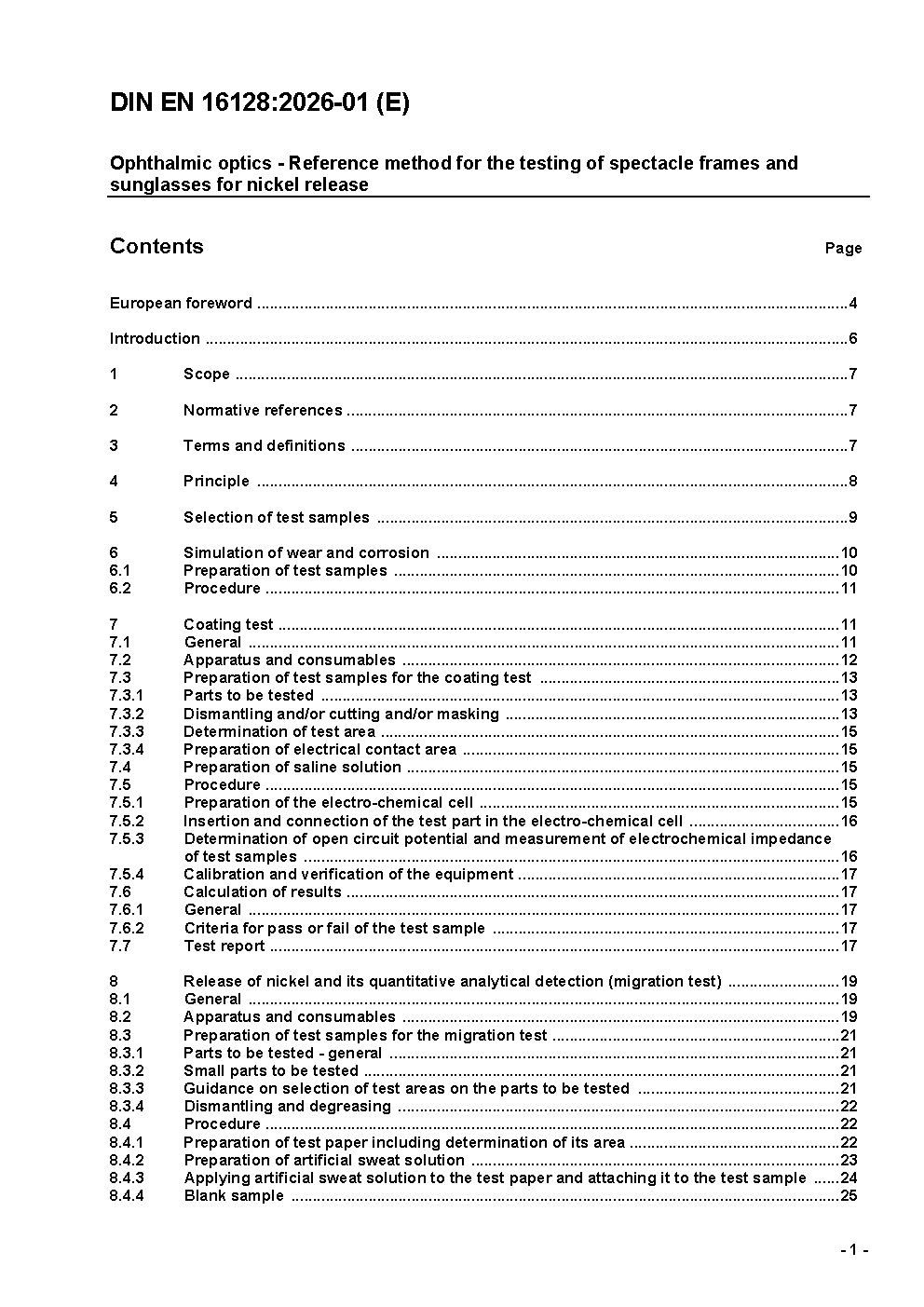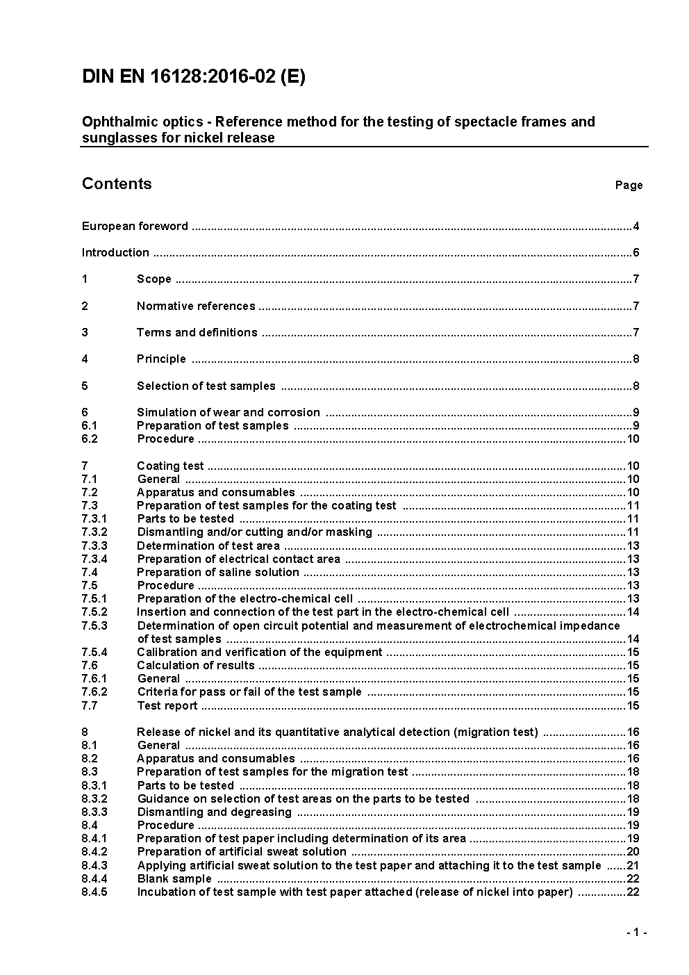 Reference test method for release of nickel from those parts of spectacle frames and sunglasses intended to come into close and prolonged contact with the skin; German version EN 16128:2011
