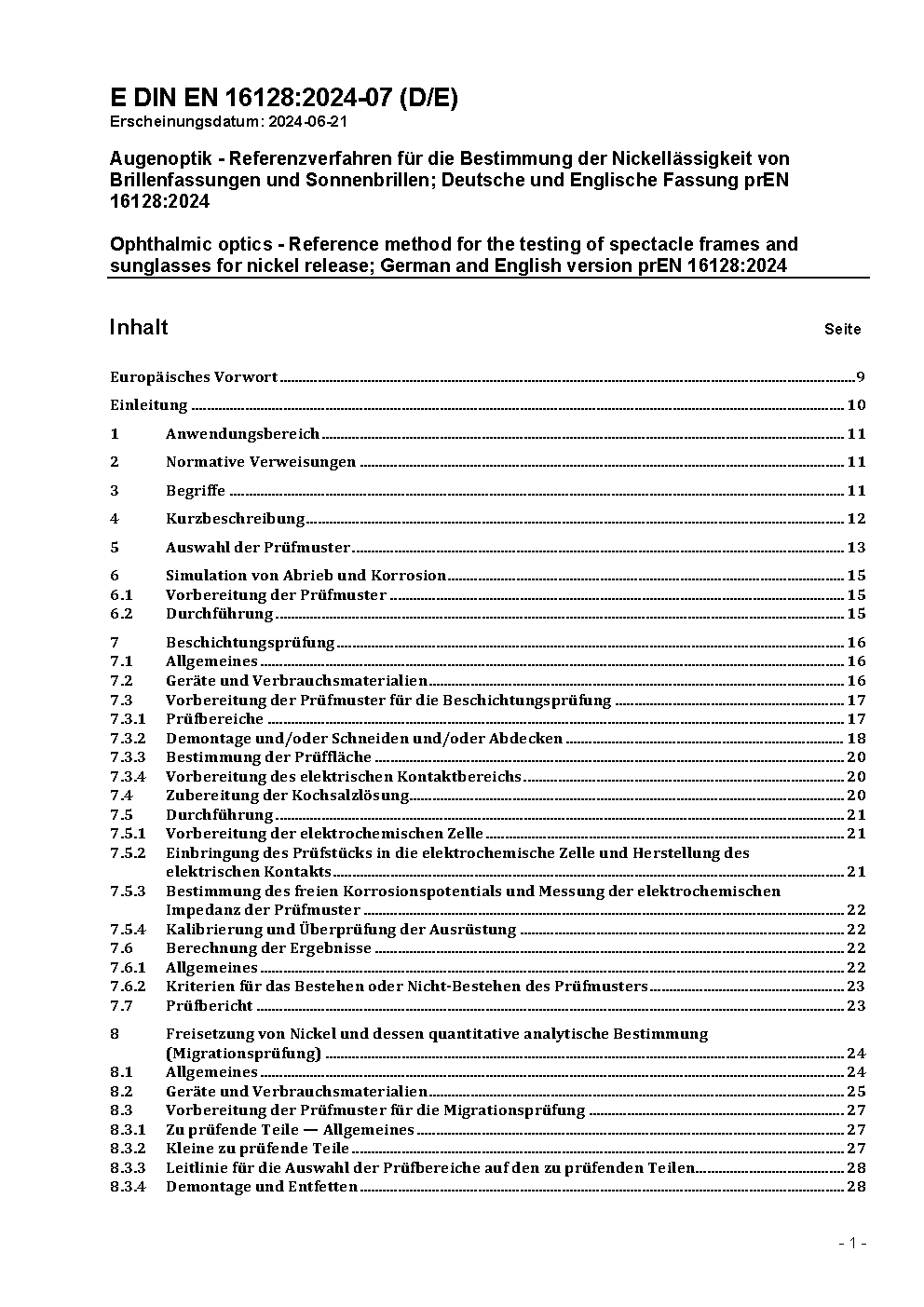 Referenzprüfverfahren zur Bestimmung der Nickellässigkeit derjenigen Teile von Brillenfassungen und Sonnenbrillen, die bestimmungsgemäß unmittelbar und länger mit der Haut in Berührung kommen; Deutsche Fassung EN 16128:2011