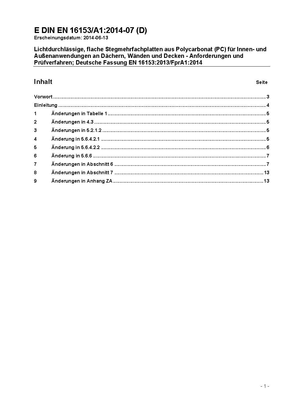 Lichtdurchlässige, flache Stegmehrfachplatten aus Polycarbonat (PC) für Innen- und Außenanwendungen an Dächern, Wänden und Decken - Anforderungen und Prüfverfahren; Deutsche Fassung EN 16153:2013/FprA1:2014
