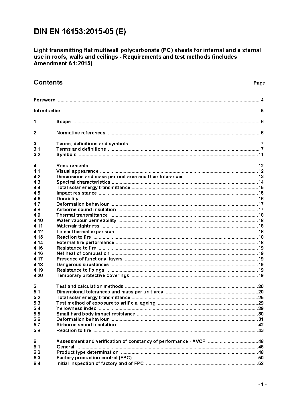 Light transmitting flat multiwall polycarbonate (PC) sheets for internal and external use in roofs, walls and ceilings - Requirements and test methods; German version EN 16153:2013/FprA1:2014