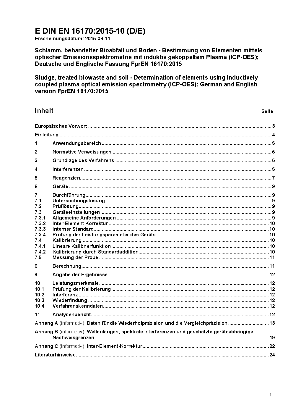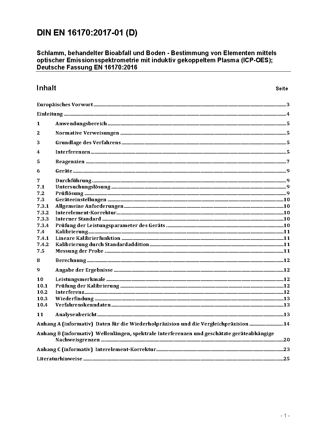 Schlamm, behandelter Bioabfall und Boden - Bestimmung von Elementen mittels optischer Emissionsspektrometrie mit induktiv gekoppeltem Plasma (ICP-OES); Deutsche Fassung EN 16170:2016