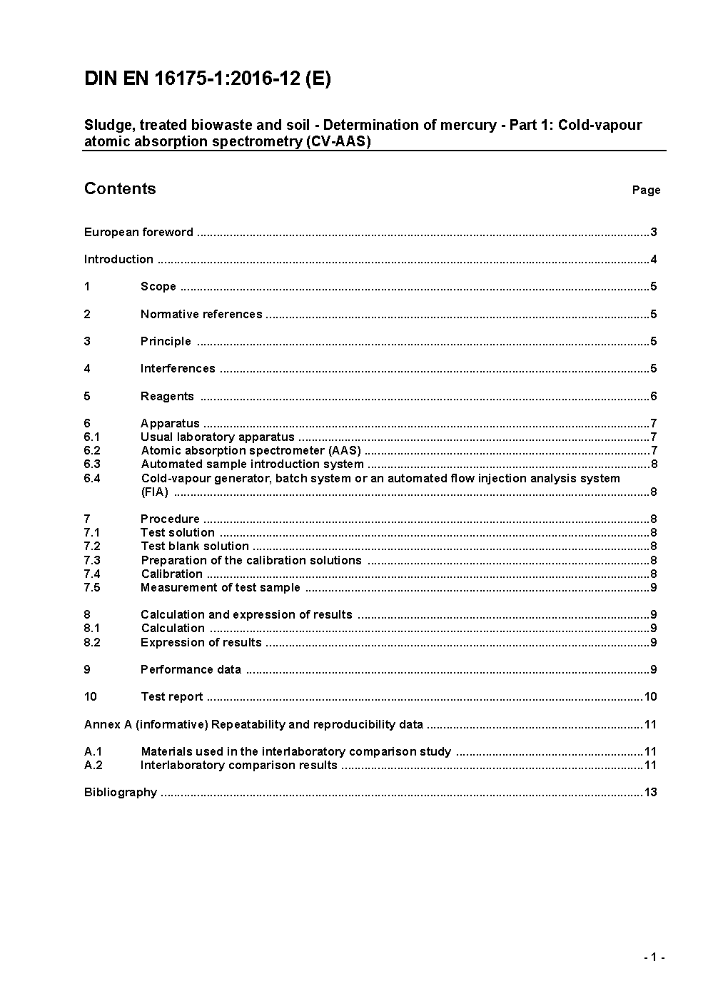 Sludge, treated biowaste and soil - Determination of mercury - Part 1: Cold-vapour atomic absorption spectrometry (CV-AAS); German version EN 16175-1:2016