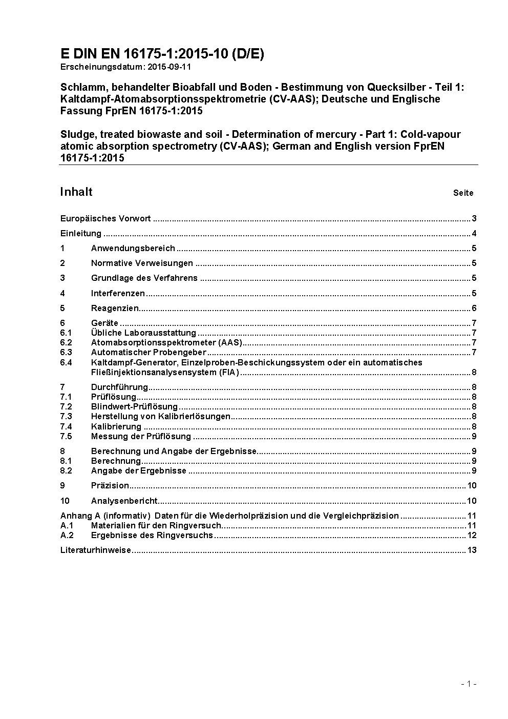 Schlamm, behandelter Bioabfall und Boden - Bestimmung von Quecksilber - Teil 1: Kaltdampf-Atomabsorptionsspektrometrie (CV-AAS); Deutsche Fassung EN 16175-1:2016