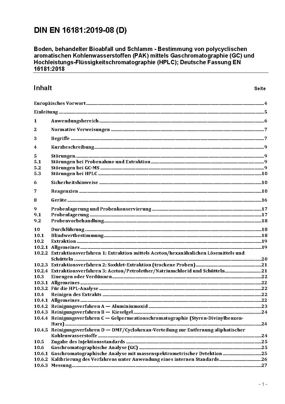 Boden, behandelter Bioabfall und Schlamm - Bestimmung von polycyclischen aromatischen Kohlenwasserstoffen (PAK) mittels Gaschromatographie (GC) und Hochleistungs-Flüssigkeitschromatographie (HPLC); Deutsche Fassung EN 16181:2018