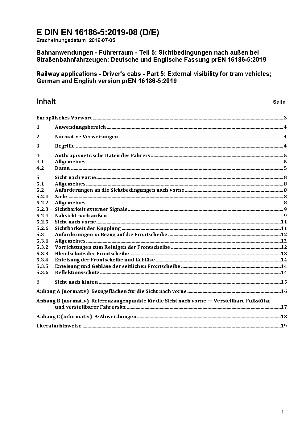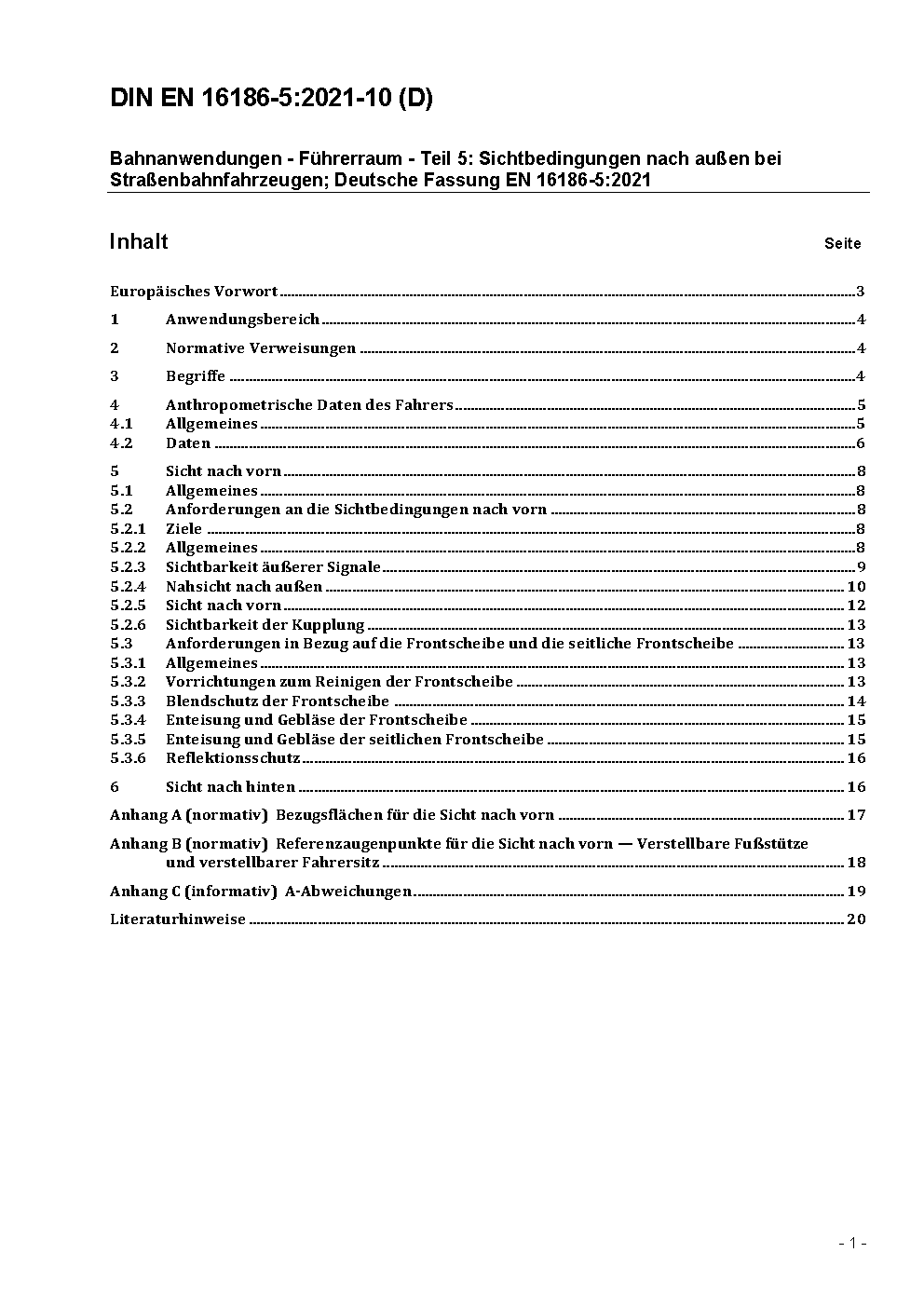 Bahnanwendungen - Führerraum - Teil 5: Sichtbedingungen nach außen bei Straßenbahnfahrzeugen; Deutsche Fassung EN 16186-5:2021