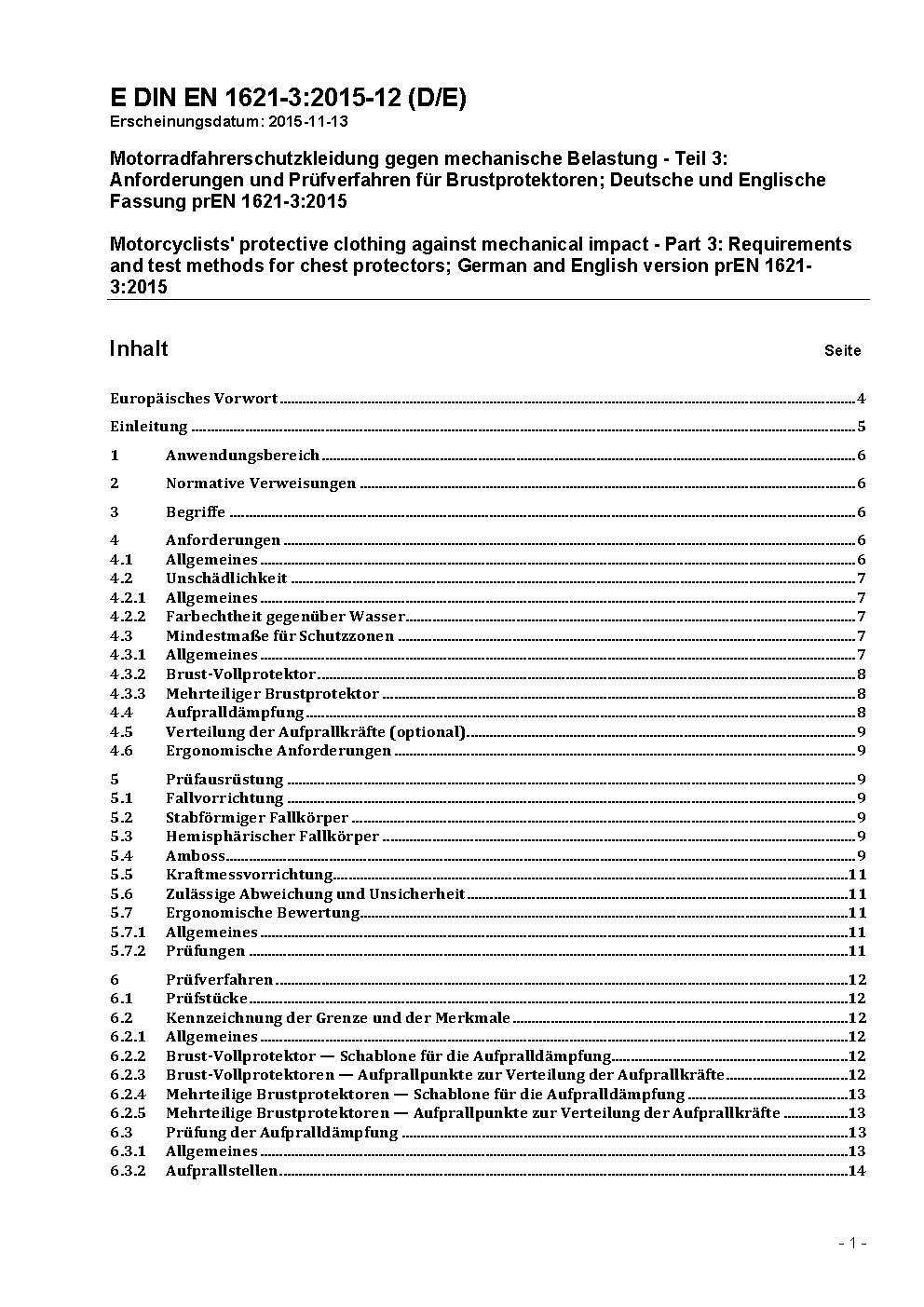 Motorradfahrer-Schutzkleidung gegen mechanische Belastung - Teil 3: Brustprotektoren für Motorradfahrer - Anforderungen und Prüfverfahren; Deutsche Fassung EN 1621-3:2018
