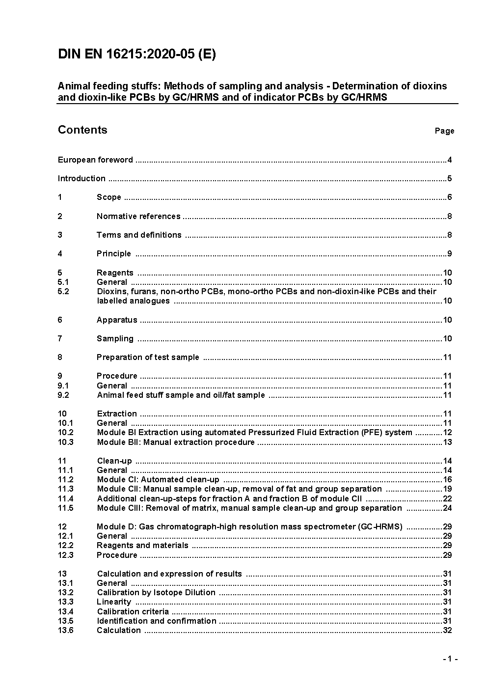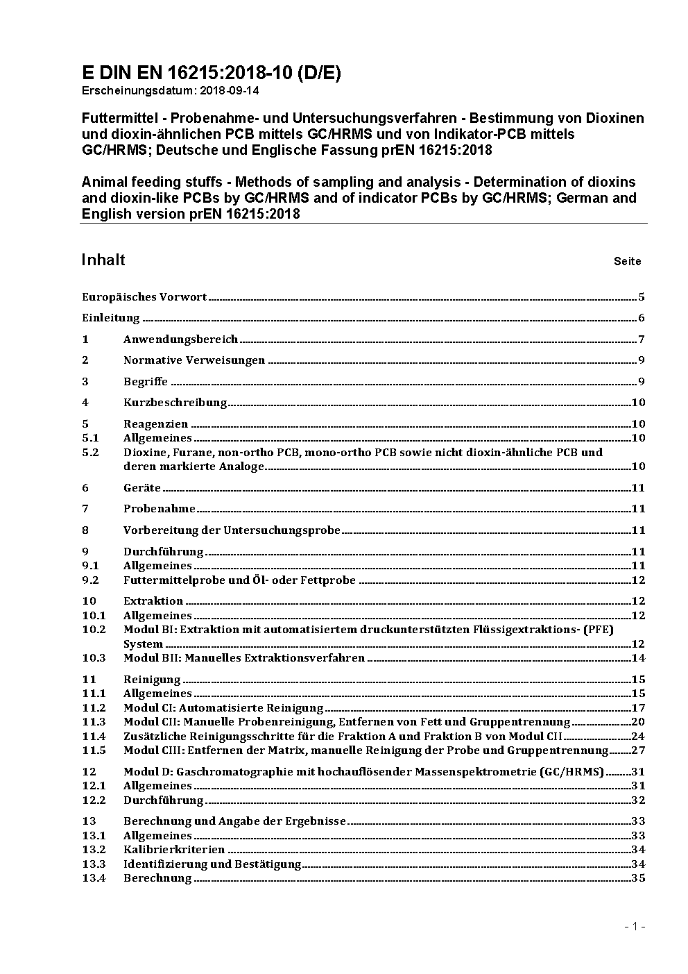 Animal feed - Determination of dioxins and dioxin-like PCBs by GC/HRMS and of indicator PCBs by GC/HRMS; German version prEN 16215:2010