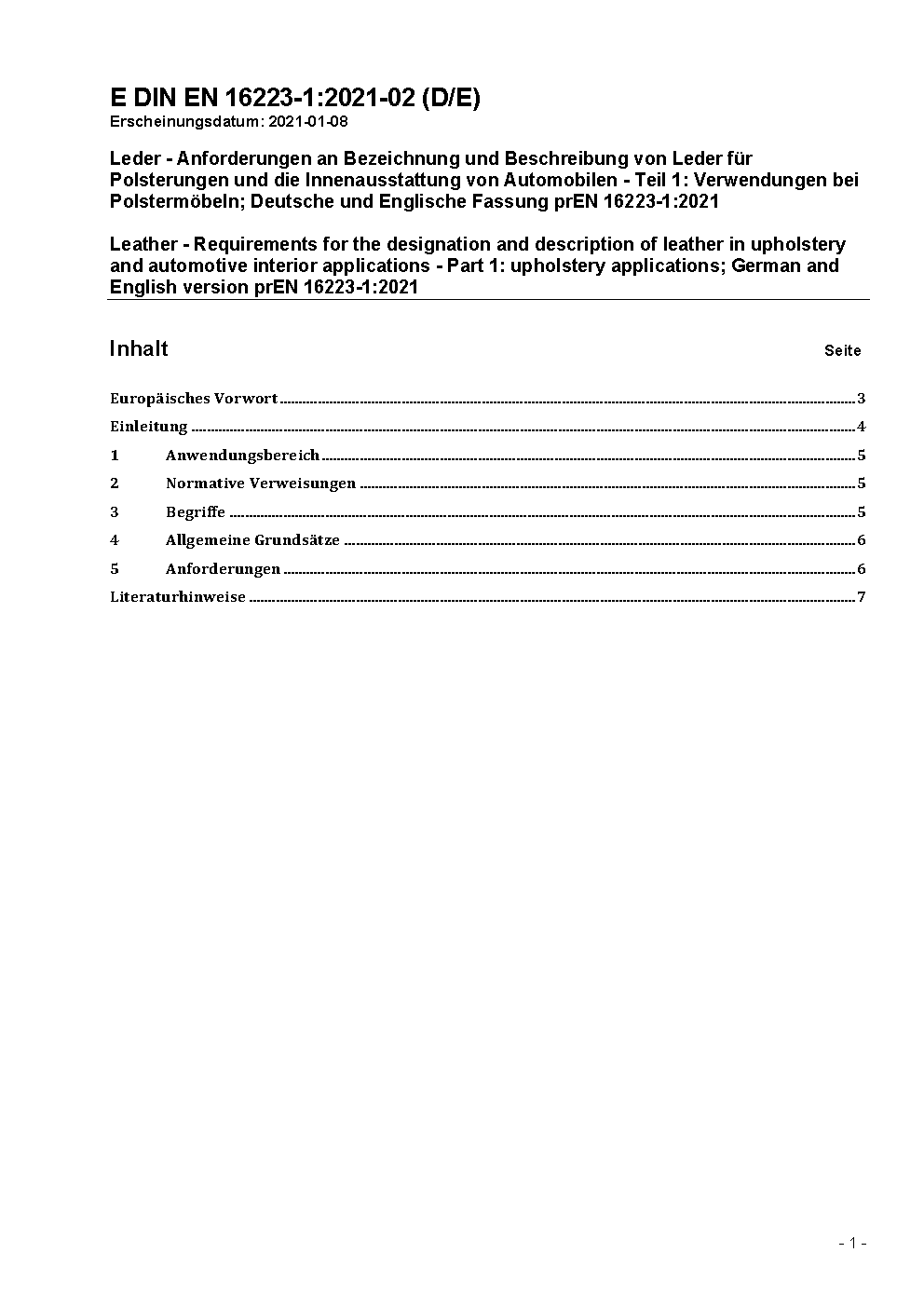 Leder - Anforderungen an Bezeichnung und Beschreibung von Leder für Polsterungen und die Innenausstattung von Automobilen - Teil 1: Verwendungen bei Polstermöbeln; Deutsche und Englische Fassung prEN 16223-1:2021