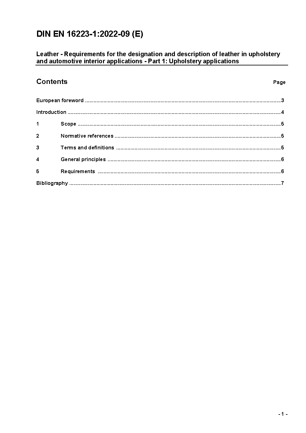 Leather - Requirements for the designation and description of leather in upholstery and automotive interior applications - Part 1: upholstery applications; German and English version prEN 16223-1:2021