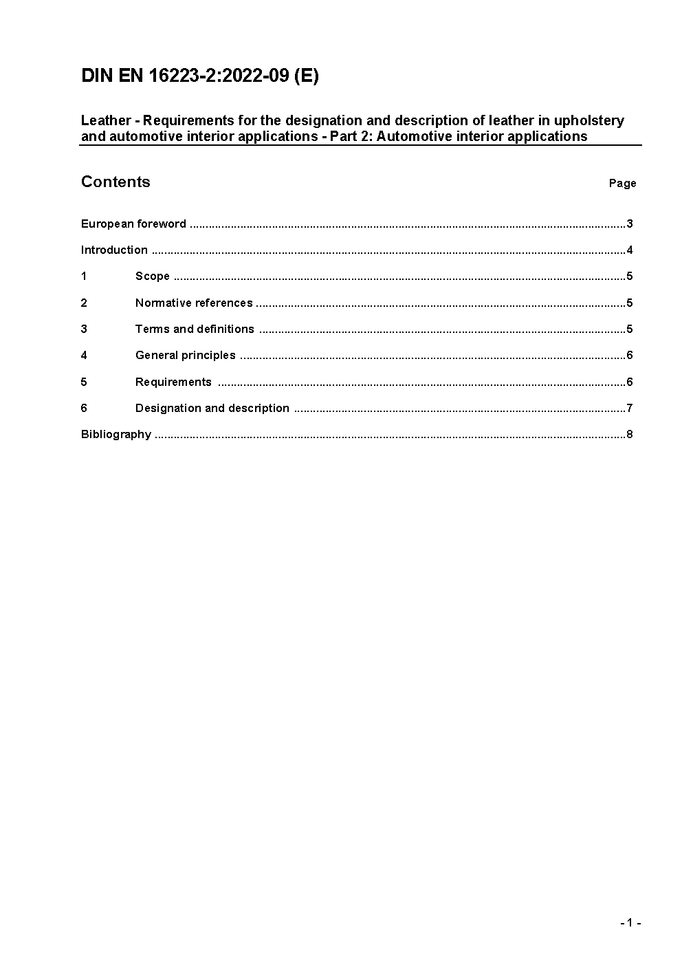 Leather - Requirements for the designation and description of leather in upholstery and automotive interior applications - Part 2: Automotive interior applications; German and English version prEN 16223-2:2021
