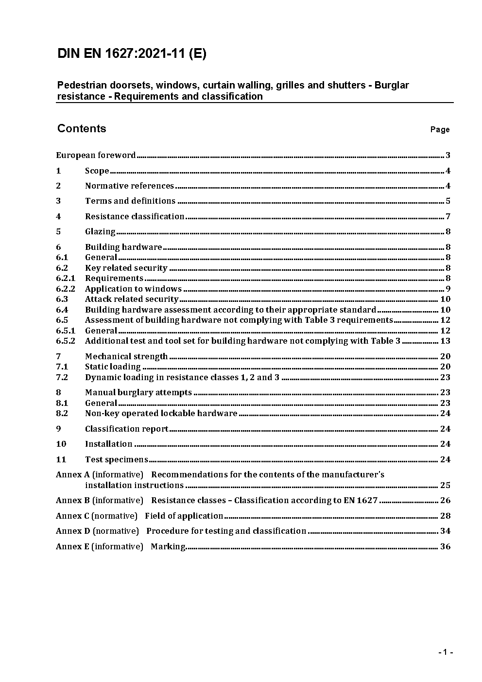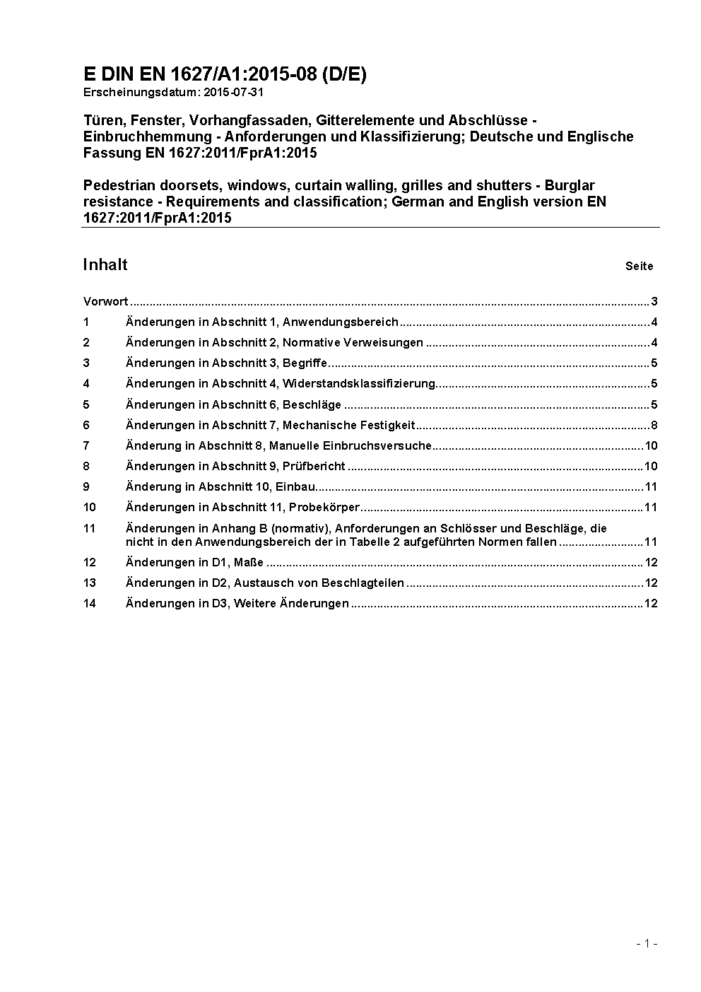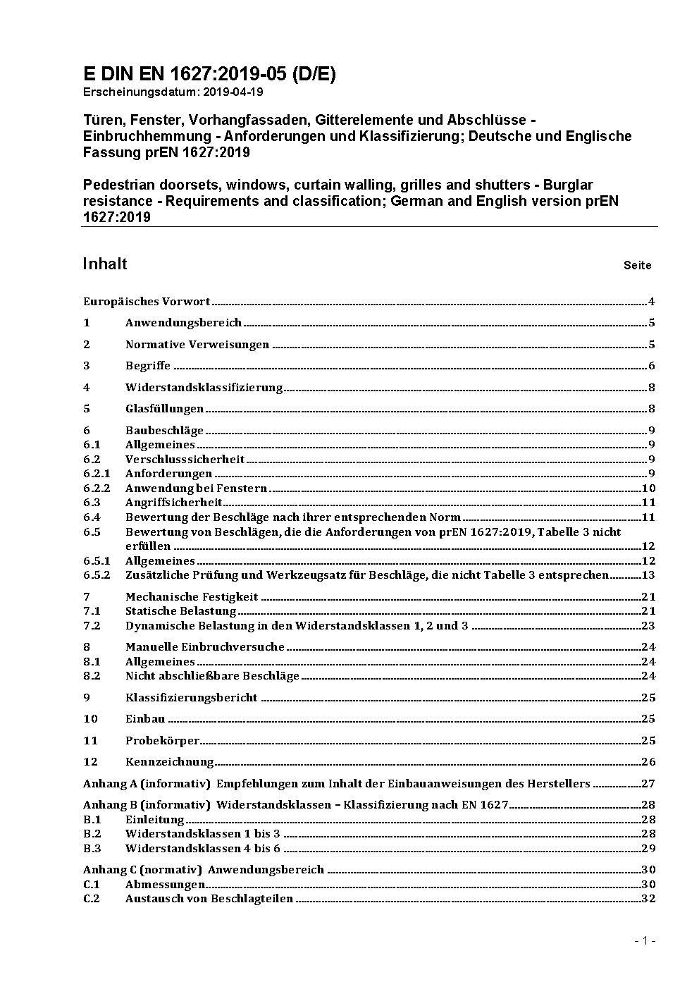Türen, Fenster, Vorhangfassaden, Gitterelemente und Abschlüsse - Einbruchhemmung - Anforderungen und Klassifizierung; Deutsche Fassung EN 1627:2011