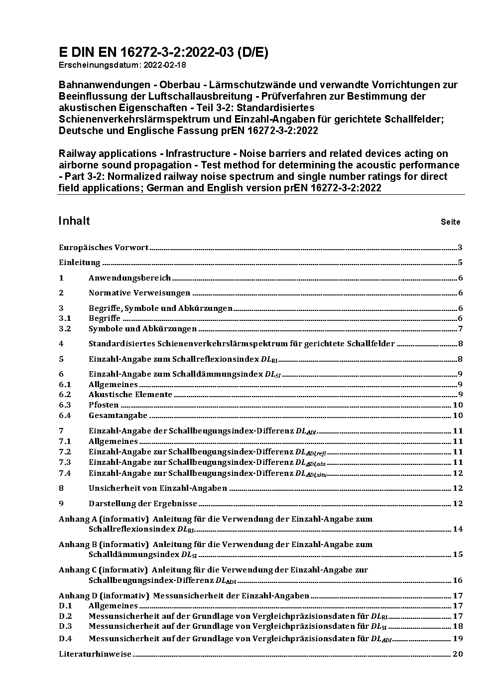 Bahnanwendungen - Oberbau - Lärmschutzwände und verwandte Vorrichtungen zur Beeinflussung der Luftschallausbreitung - Prüfverfahren zur Bestimmung der akustischen Eigenschaften - Teil 3-2: Standardisiertes Schienenverkehrslärmspektrum und Einzahl-Angaben für gerichtete Schallfelder; Deutsche Fassung prEN 16272-3-2:2012