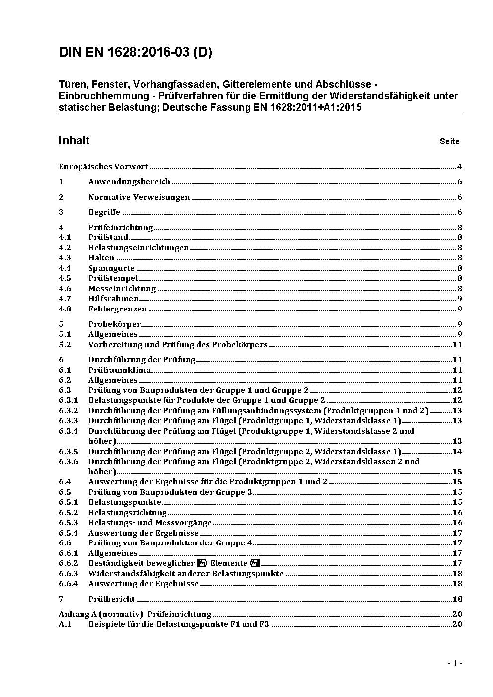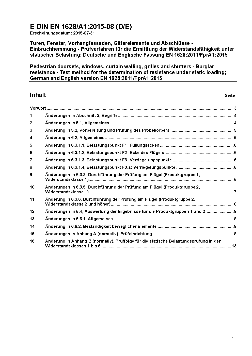 Türen, Fenster, Vorhangfassaden, Gitterelemente und Abschlüsse - Einbruchhemmung - Prüfverfahren für die Ermittlung der Widerstandsfähigkeit unter statischer Belastung; Deutsche Fassung EN 1628:2011+A1:2015