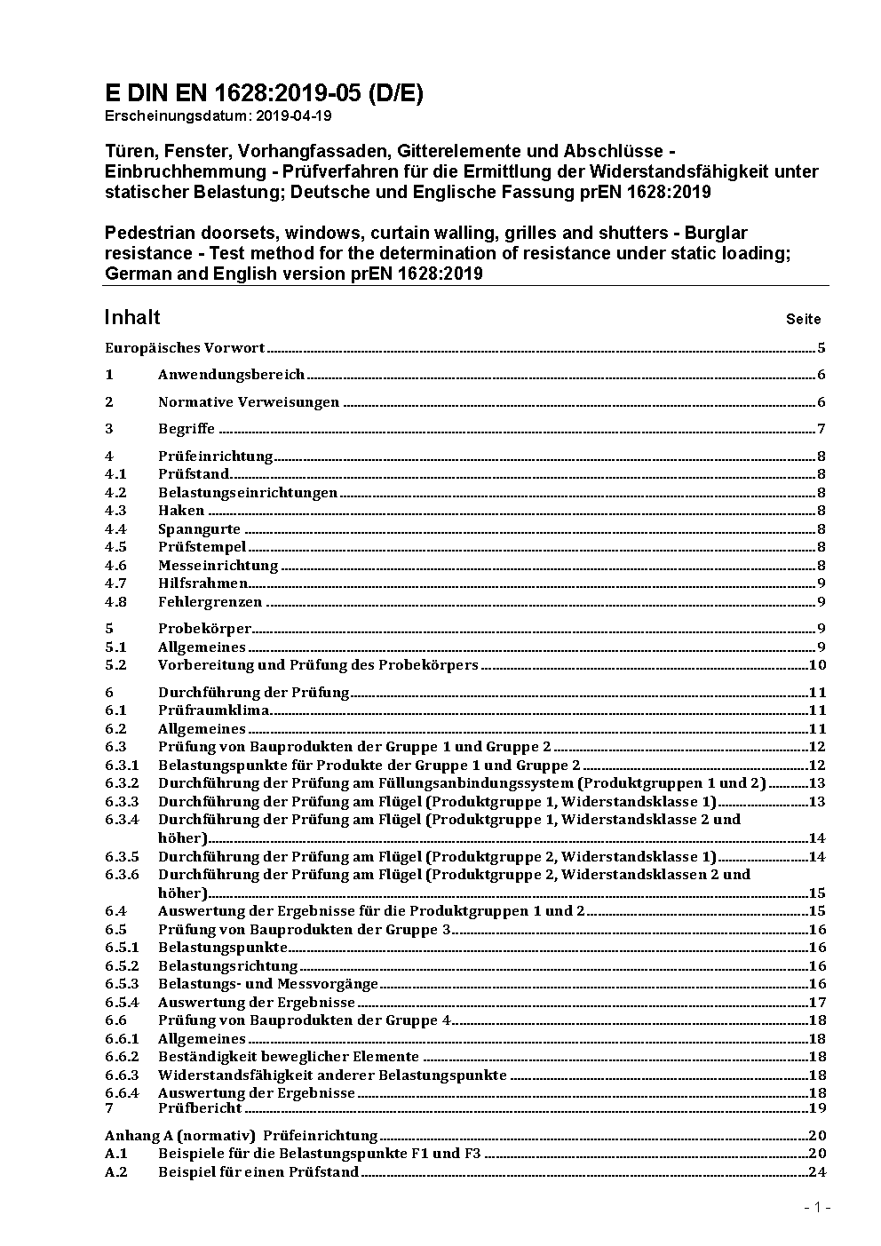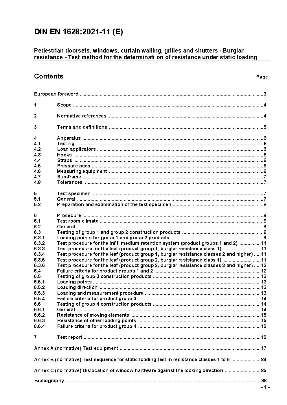 Pedestrian doorsets, windows, curtain walling, grilles and shutters - Burglar resistance - Test method for the determination of resistance under static loading; German version EN 1628:2011+A1:2015