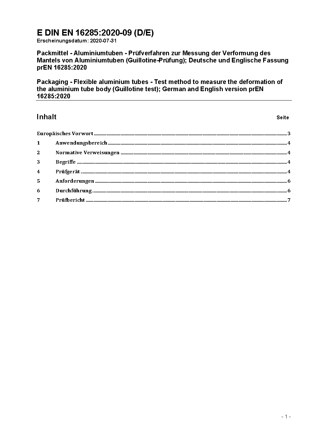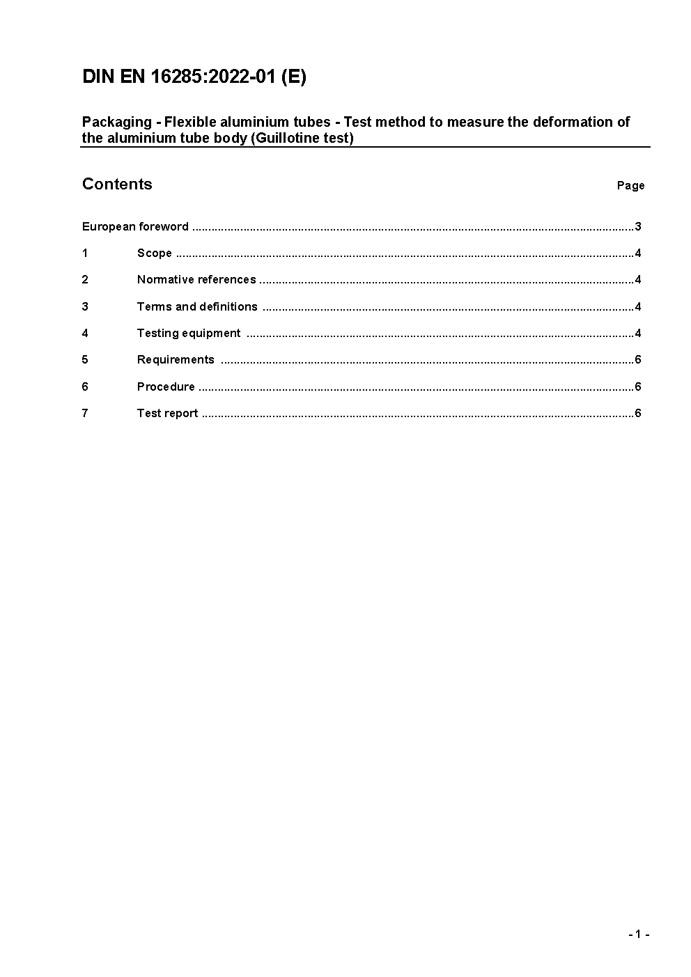 Packaging - Flexible aluminium tubes - Test method to measure the deformation of the aluminium tube body (Guillotine test); German version EN 16285:2021
