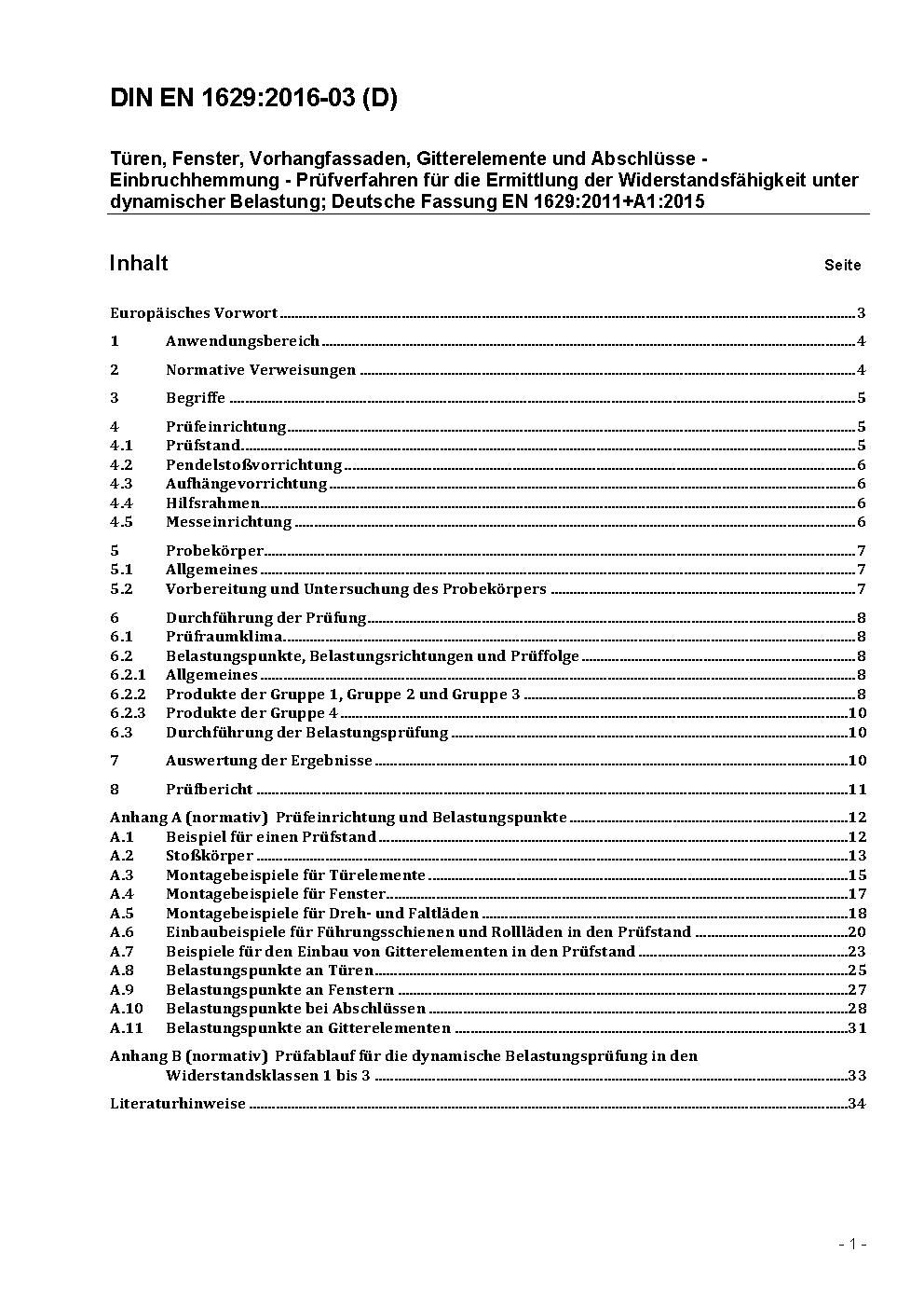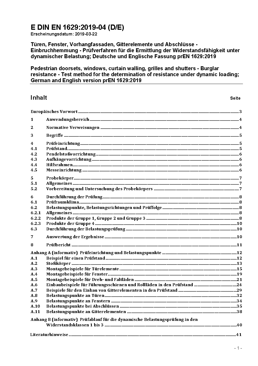 Türen, Fenster, Vorhangfassaden, Gitterelemente und Abschlüsse - Einbruchhemmung - Prüfverfahren für die Ermittlung der Widerstandsfähigkeit unter dynamischer Belastung; Deutsche Fassung EN 1629:2011