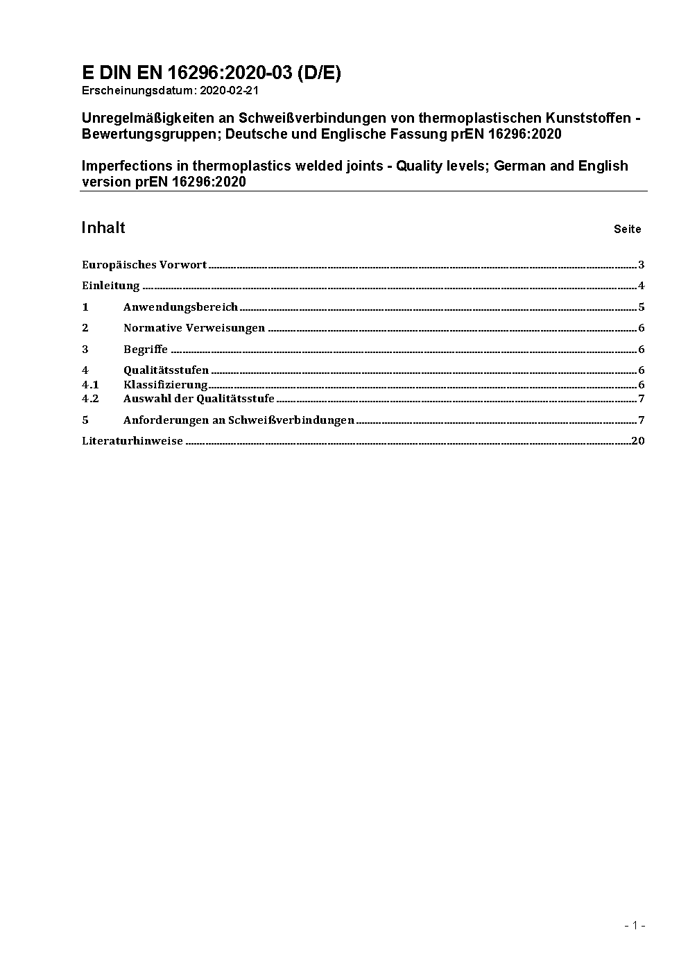 Unregelmäßigkeiten an Schweißverbindungen von thermoplastischen Kunststoffen - Qualitätsstufen; Deutsche Fassung EN 16296:2012