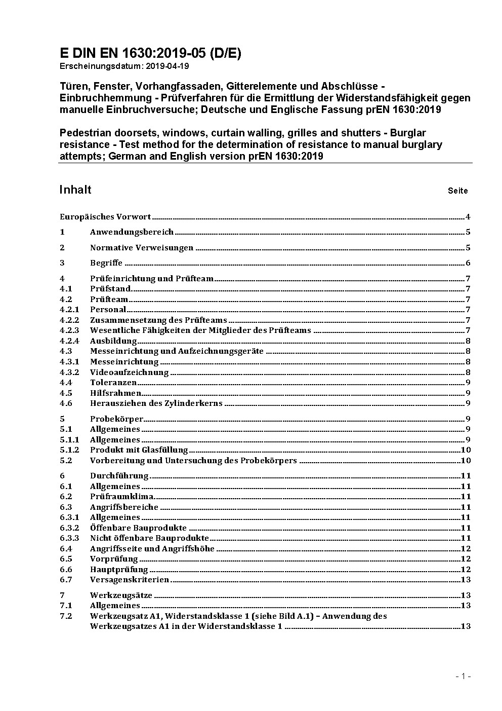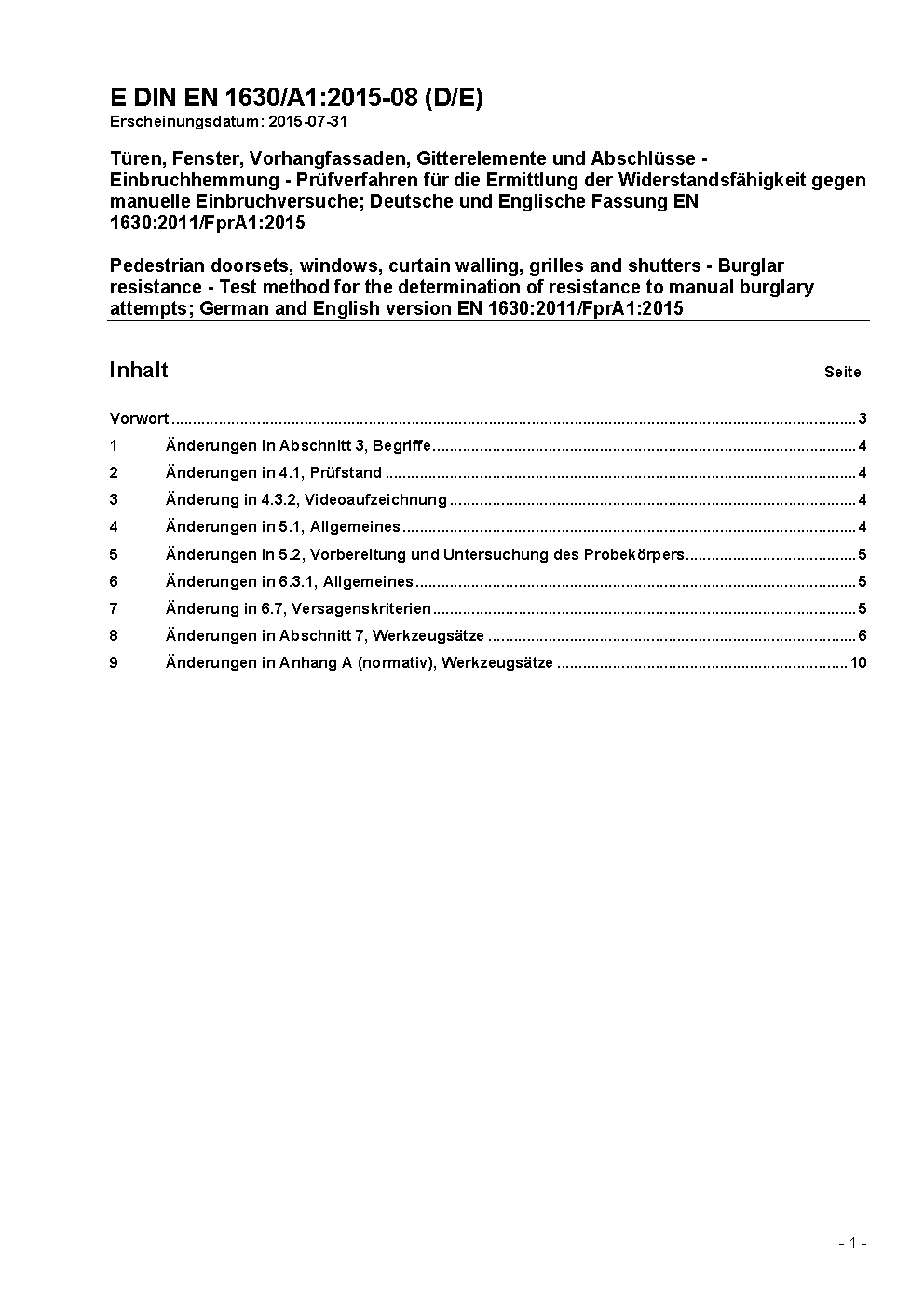 Pedestrian doorsets, windows, curtain walling, grilles and shutters - Burglar resistance - Test method for the determination of resistance to manual burglary attempts; German version EN 1630:2011+A1:2015