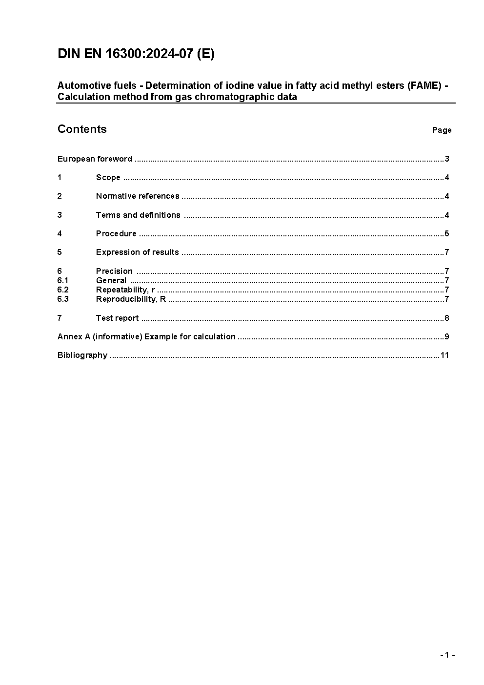 Automotive fuels - Determination of iodine value in fatty acid methyl esters (FAME) - Calculation method from gas chromatographic data; German version EN 16300:2012