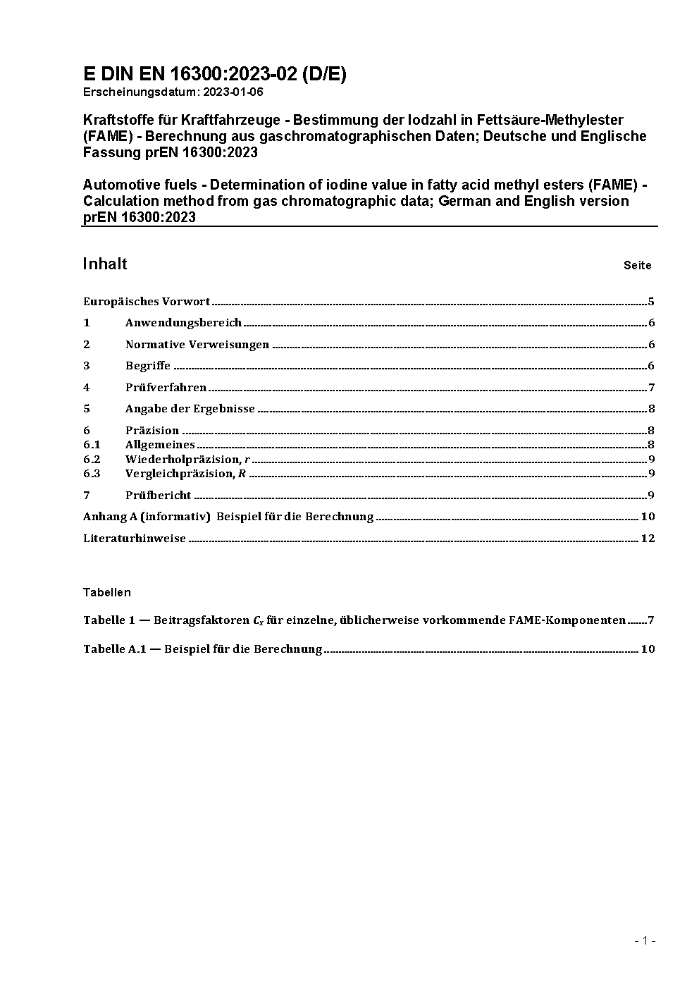 Kraftstoffe für Kraftfahrzeuge - Bestimmung der Iodzahl in Fettsäure-Methylester (FAME) - Berechnung aus gaschromatographischen Daten; Deutsche Fassung EN 16300:2012