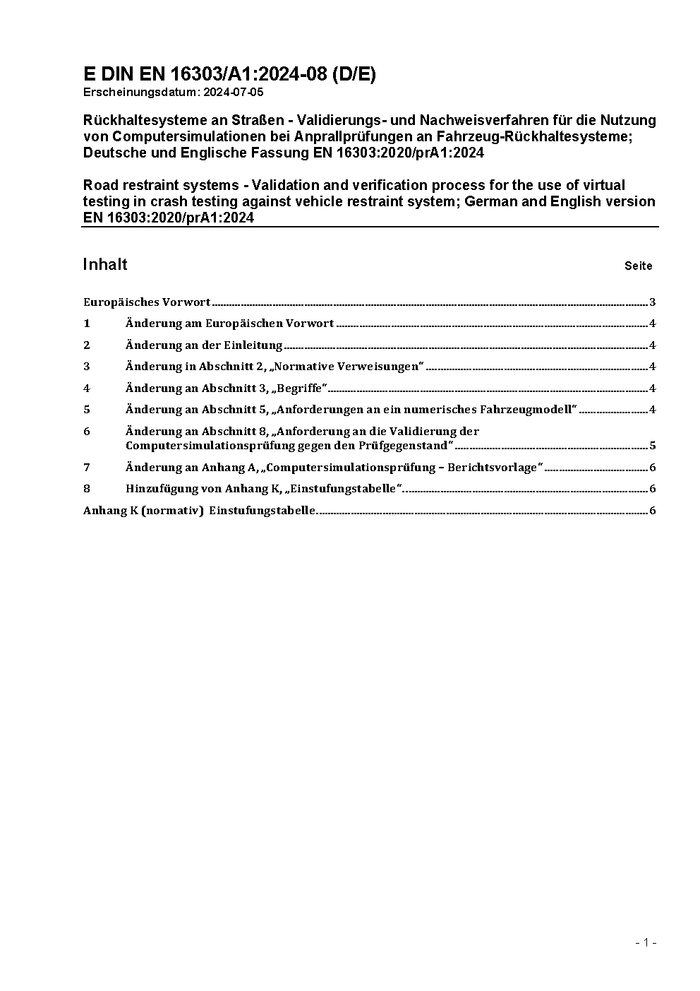 Rückhaltesysteme an Straßen - Validierungs- und Nachweisverfahren für die Nutzung von Computersimulationen bei Anprallprüfungen an Fahrzeug-Rückhaltesysteme; Deutsche und Englische Fassung EN 16303:2020/prA1:2024