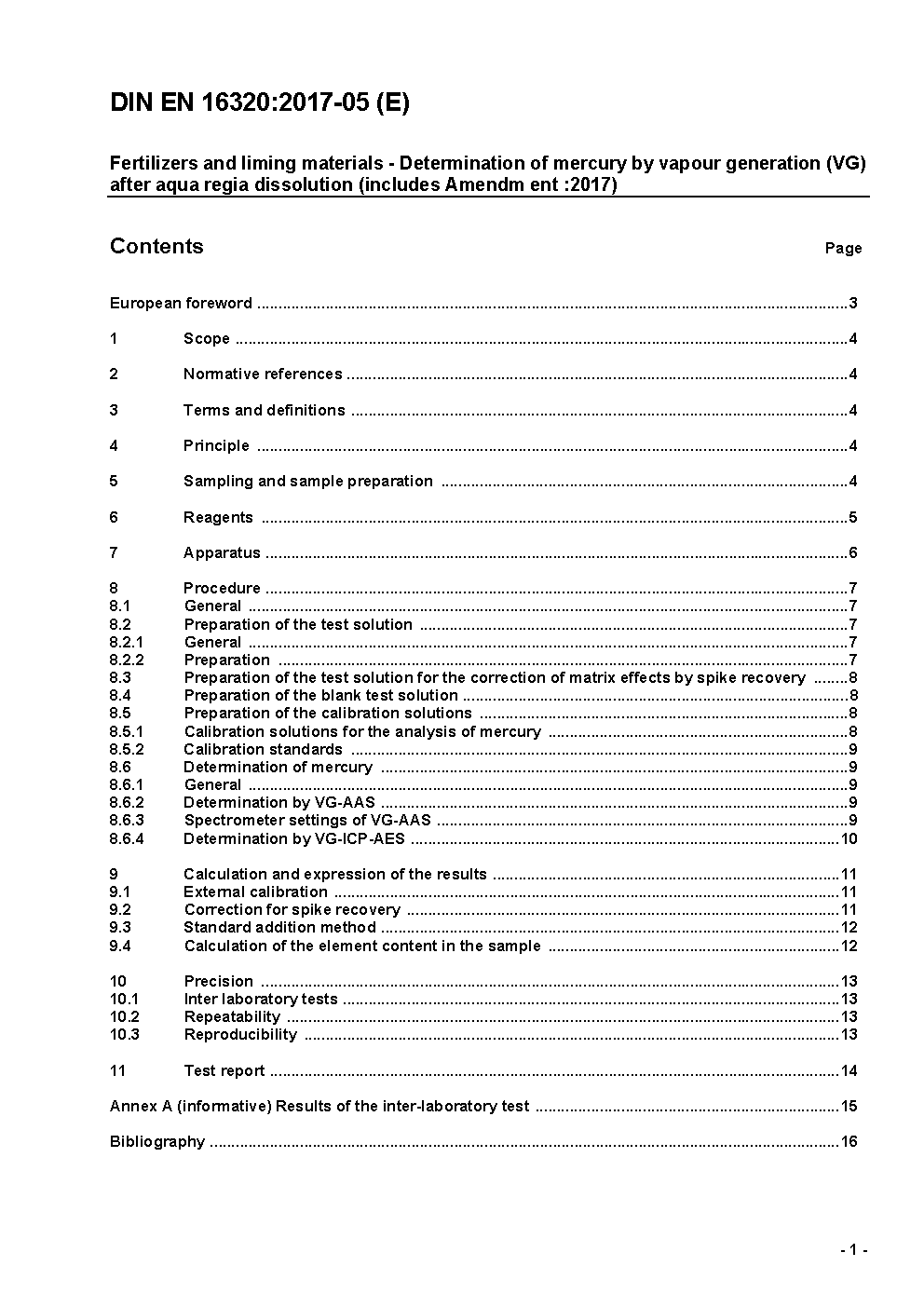 Fertilizers and liming materials - Determination of mercury by vapour generation (VG) after aqua regia dissolution; German version EN 16320:2013+A1:2017