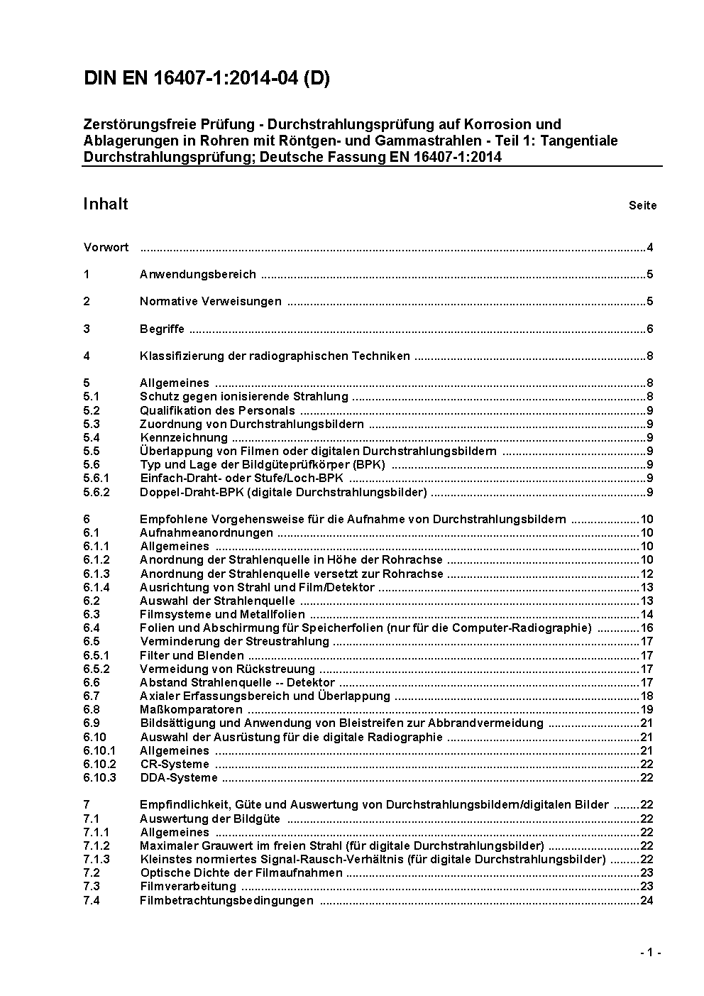 Zerstörungsfreie Prüfung - Durchstrahlungsprüfung auf Korrosion und Ablagerungen in Rohren mit Röntgen- und Gammastrahlen - Teil 1: Tangentiale Durchstrahlungsprüfung; Deutsche Fassung EN 16407-1:2014