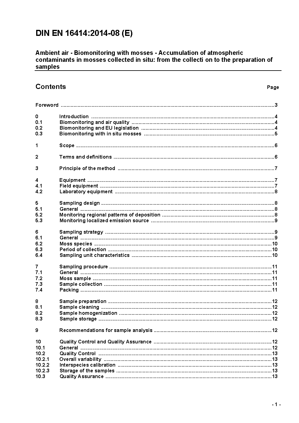 Ambient air - Biomonitoring with mosses - Accumulation of atmospheric contaminants in mosses collected in situ: from the collection to the preparation of samples; German version EN 16414:2014