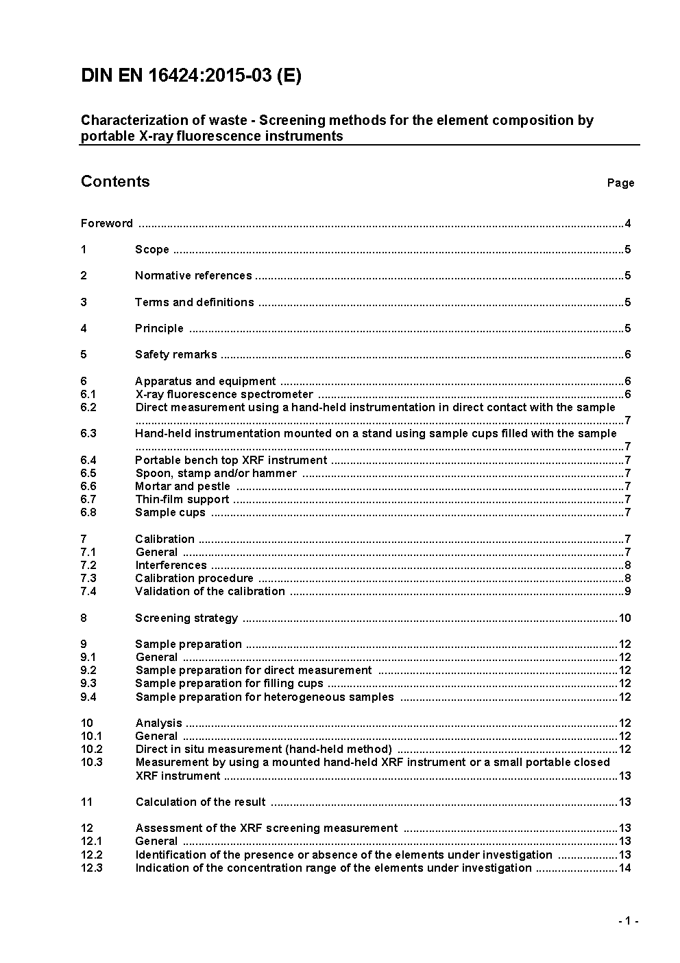 Characterization of waste - Screening methods for the element composition by portable X-ray fluorescence instruments; German version prEN 16424:2012
