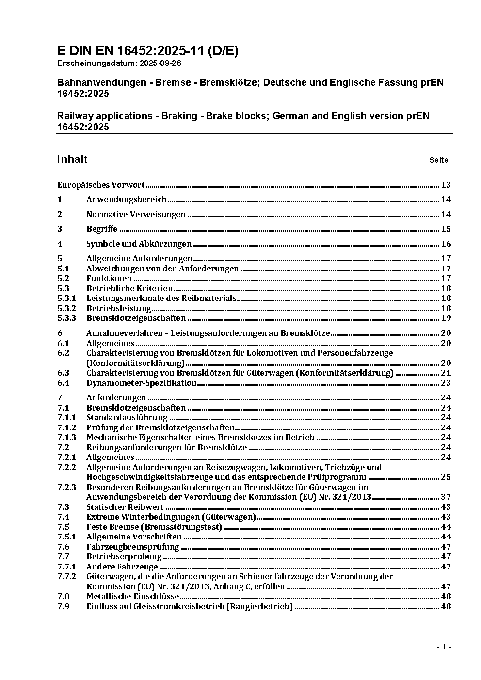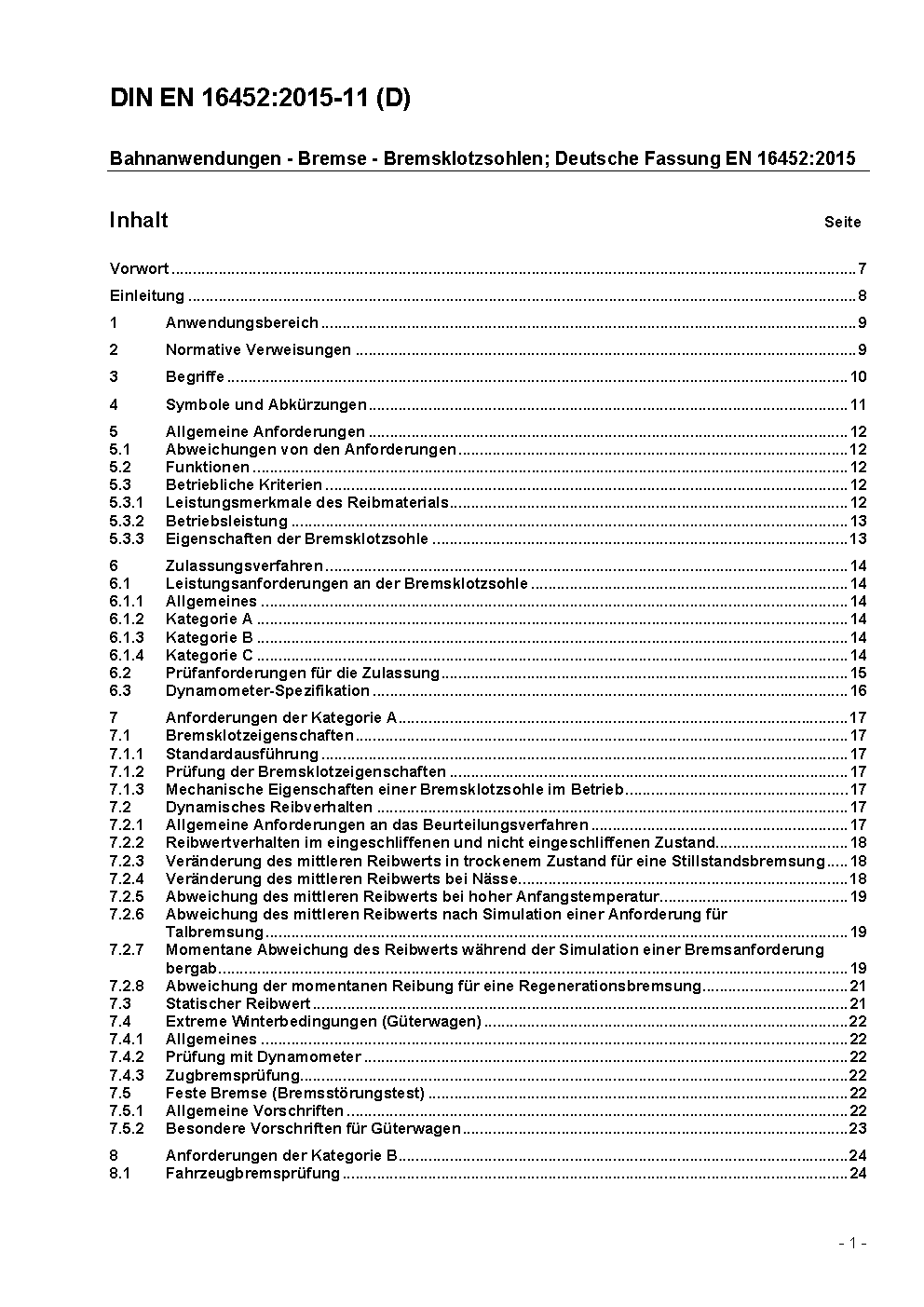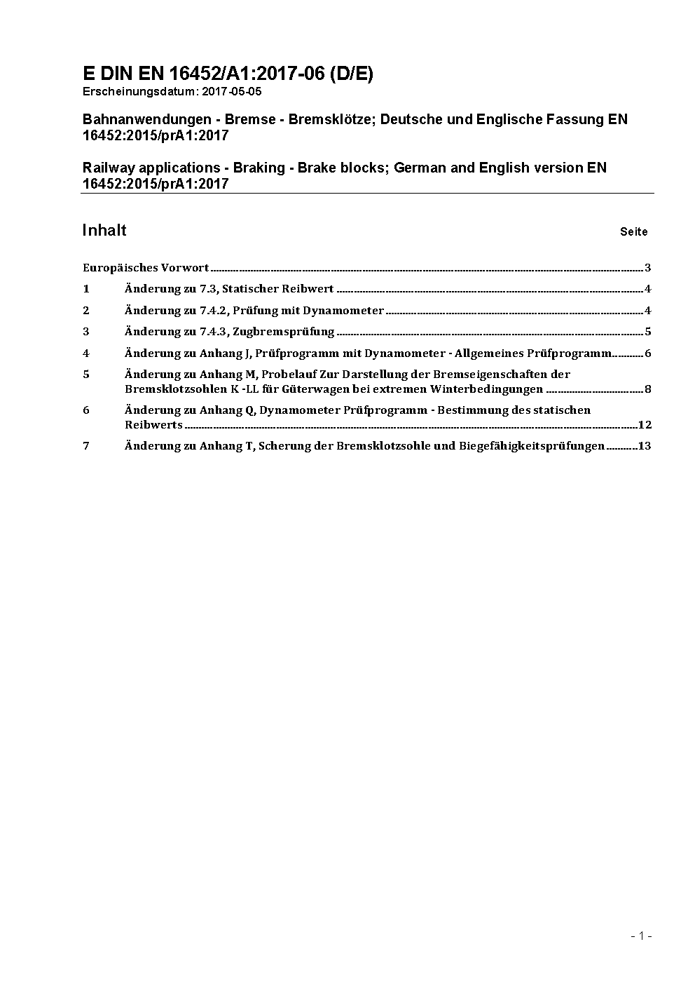 Bahnanwendungen - Bremse - Bremsklötze; Deutsche und Englische Fassung EN 16452:2015/prA1:2017