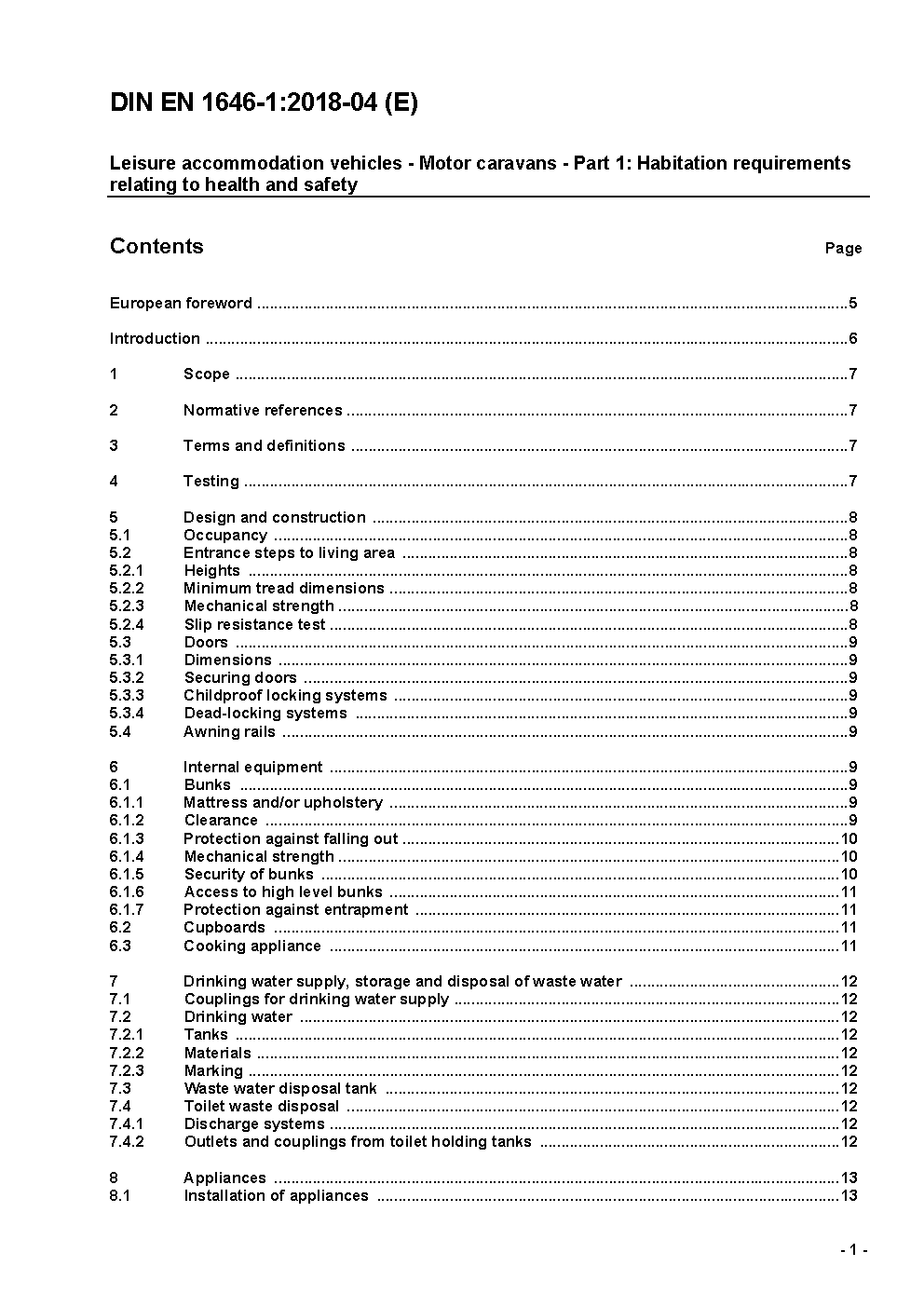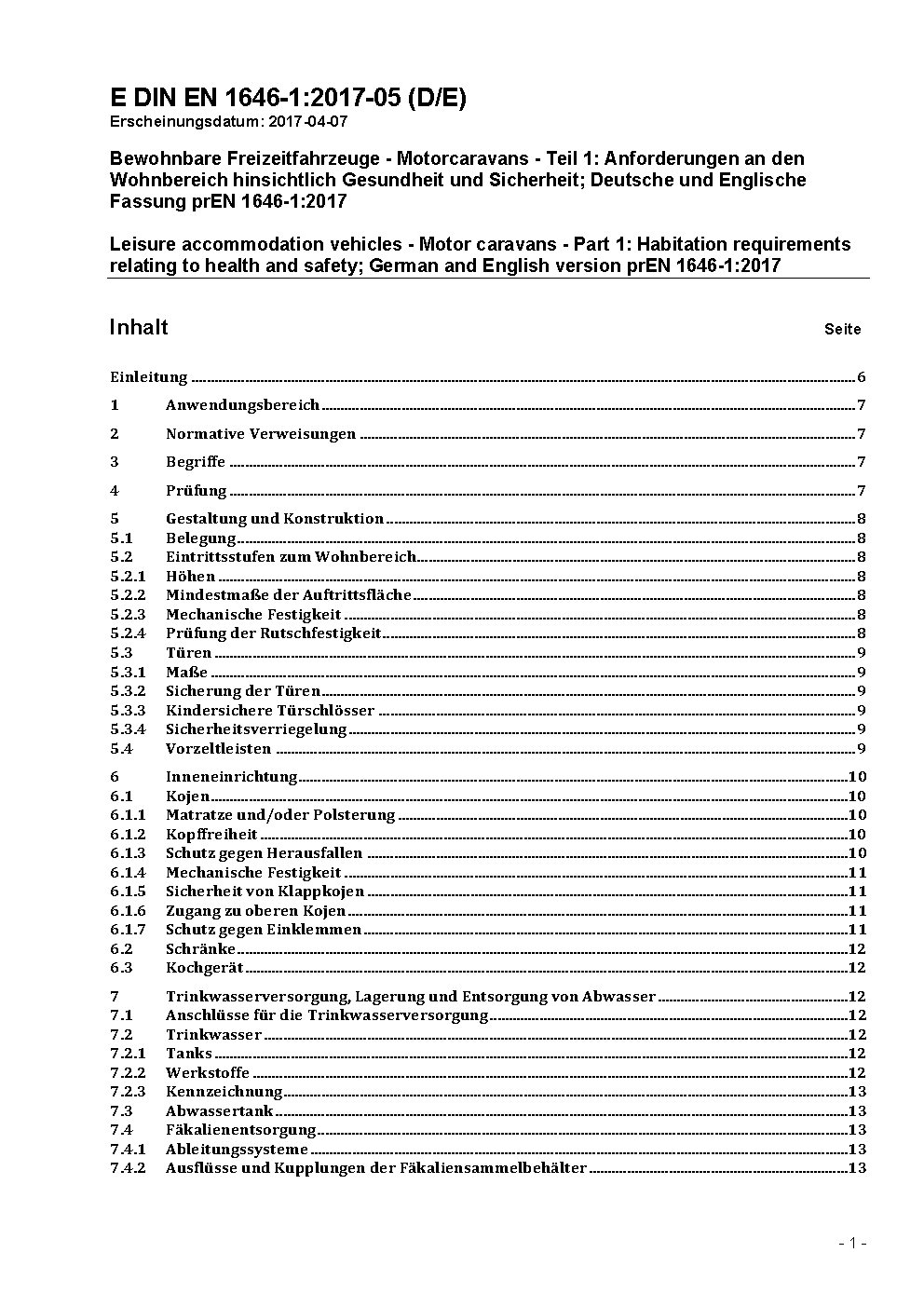 Bewohnbare Freizeitfahrzeuge - Motorcaravans - Teil 1: Anforderungen an den Wohnbereich hinsichtlich Gesundheit und Sicherheit; Änderung A1; Deutsche Fassung EN 1646-1:1998/A1:2001