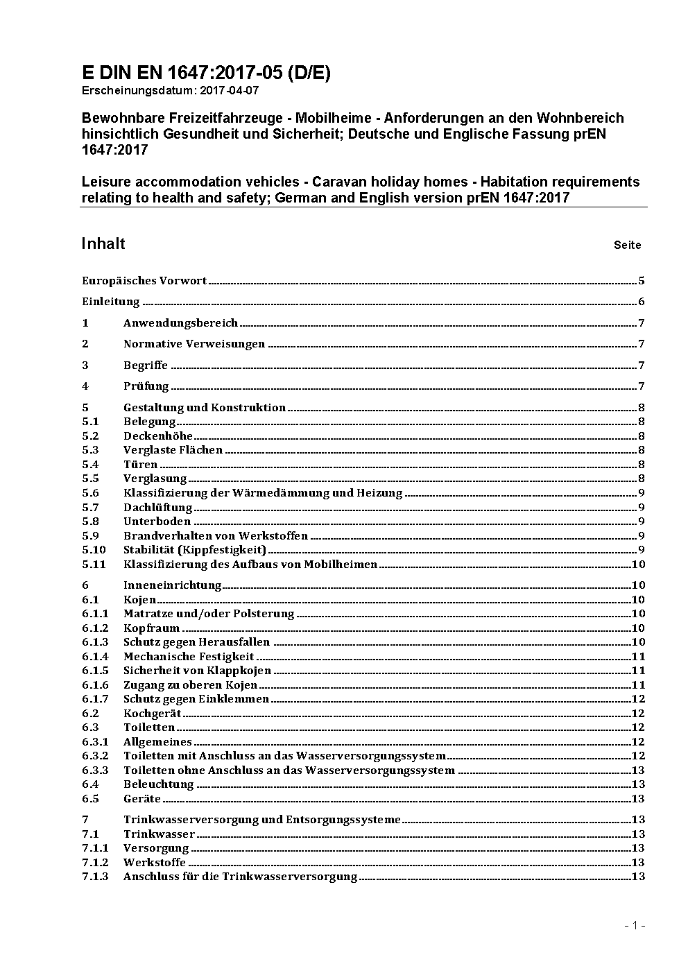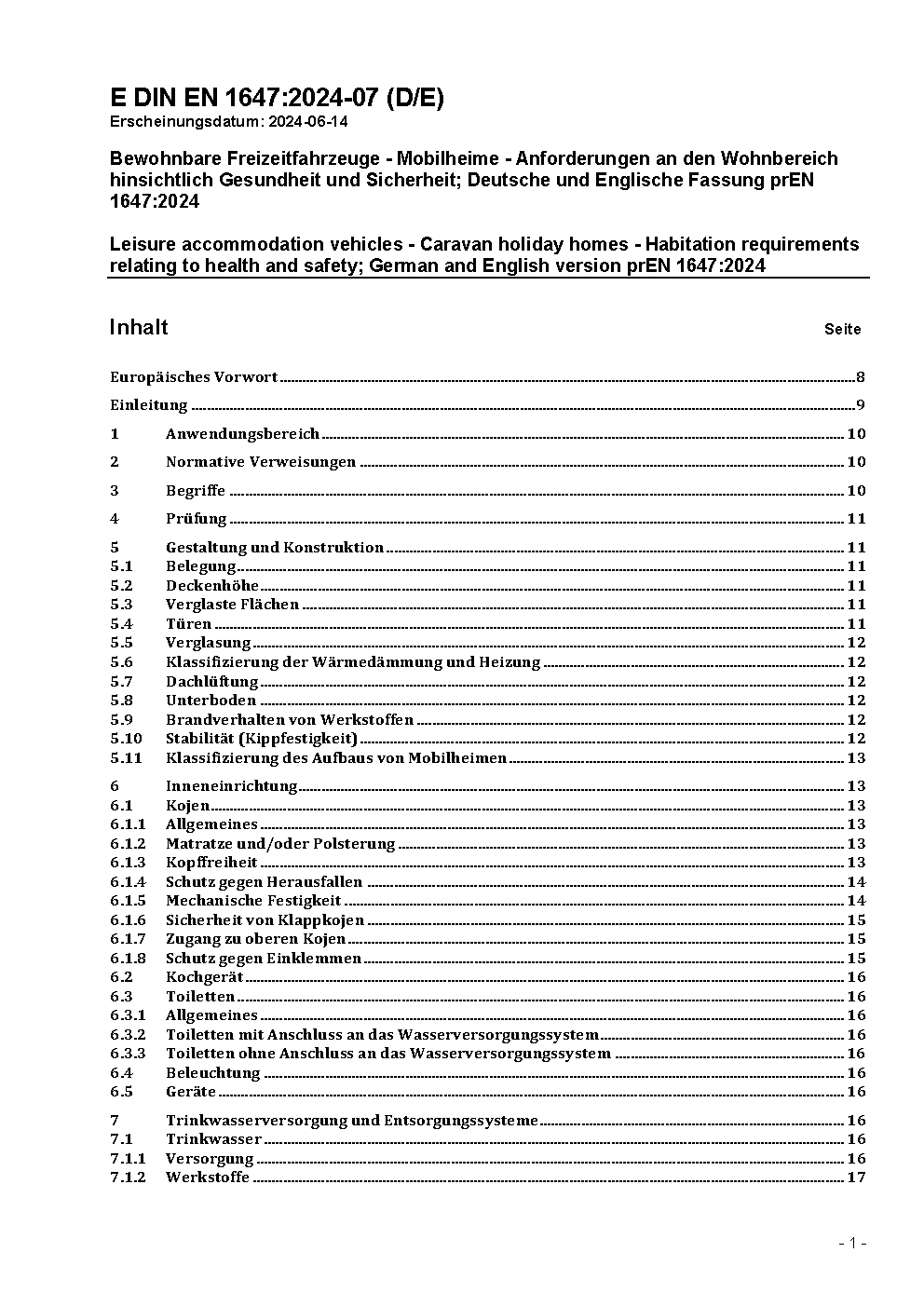 Bewohnbare Freizeitfahrzeuge - Mobilheime - Anforderungen an den Wohnbereich hinsichtlich Gesundheit und Sicherheit; Deutsche und Englische Fassung EN 1647:2018/prA1:2020