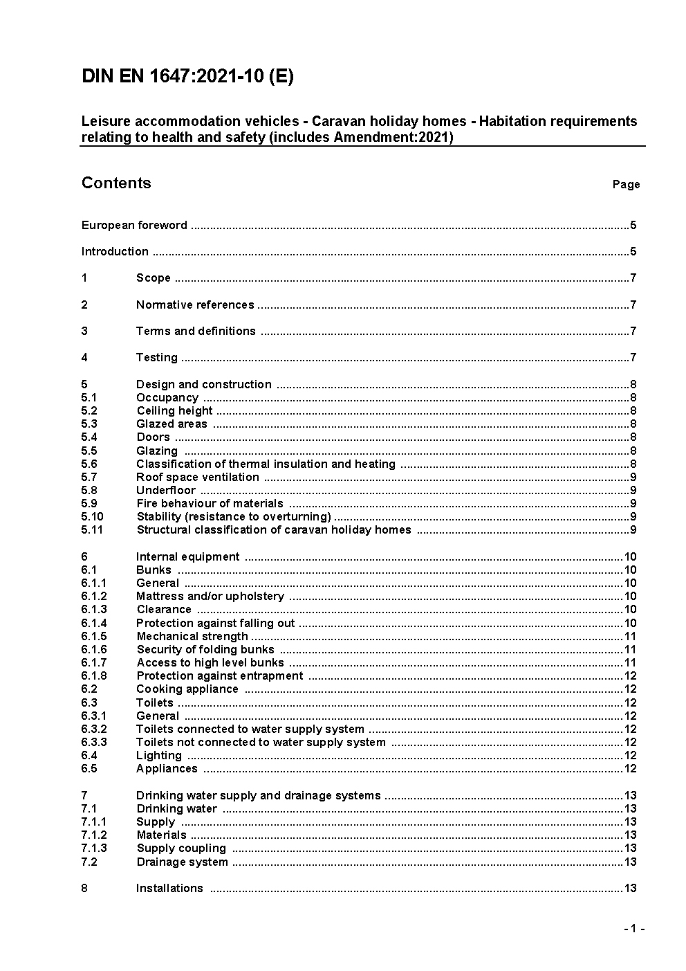 Leisure accommodation vehicles - Caravan holiday homes - Habitation requirements relating to health and safety; German and English version EN 1647:2018/prA1:2020