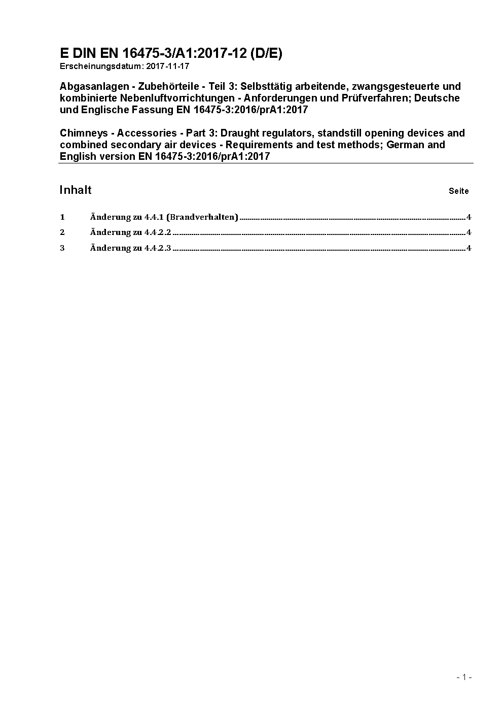 Chimneys - Accessories - Part 3: Draught regulators, standstill opening devices and combined secondary air devices - Requirements and test methods; German version EN 16475-3:2016