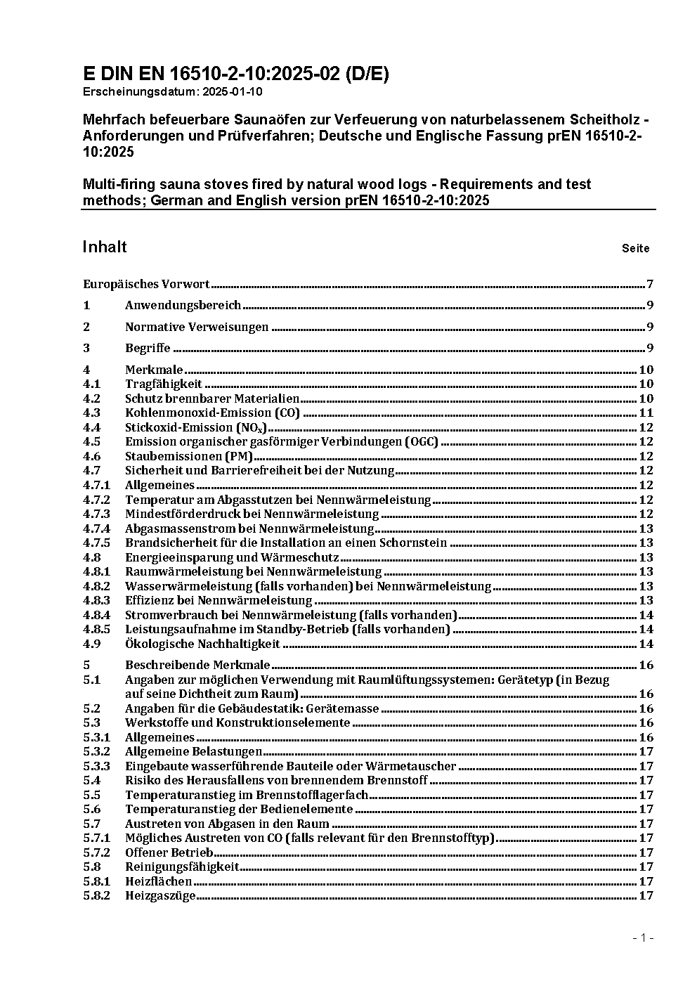 Mehrfach befeuerbare Saunaöfen zur Verfeuerung von naturbelassenem Scheitholz - Anforderungen und Prüfverfahren; Deutsche und Englische Fassung prEN 16510-2-10:2025