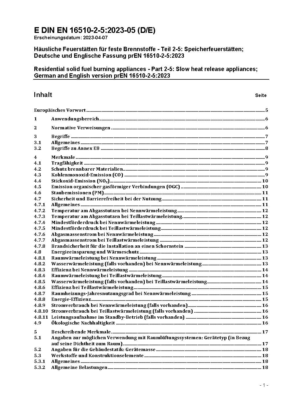Häusliche Feuerstätten für feste Brennstoffe - Teil 2-5: Speicherfeuerstätten; Deutsche Fassung EN 16510-2-5:2025 / Achtung: Daneben gelten DIN EN 15250 (2007-06) und DIN EN 15250 Berichtigung 1 (2015-05) noch bis 2025-10-31.