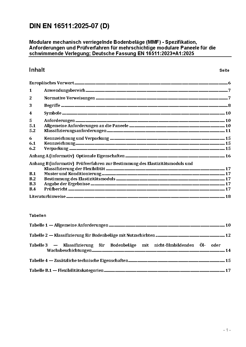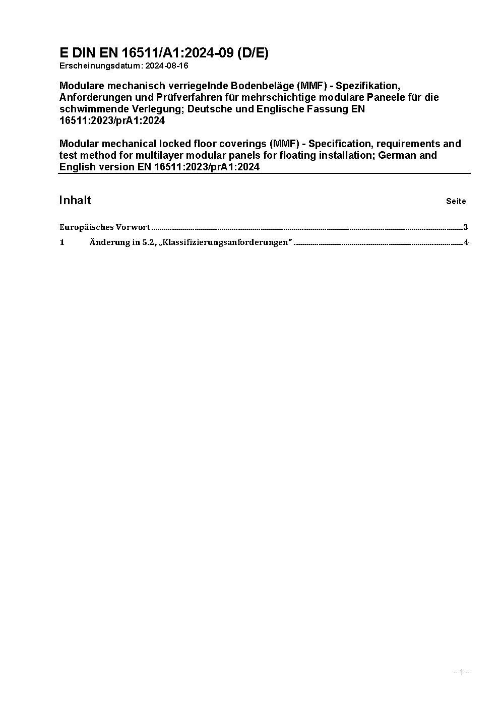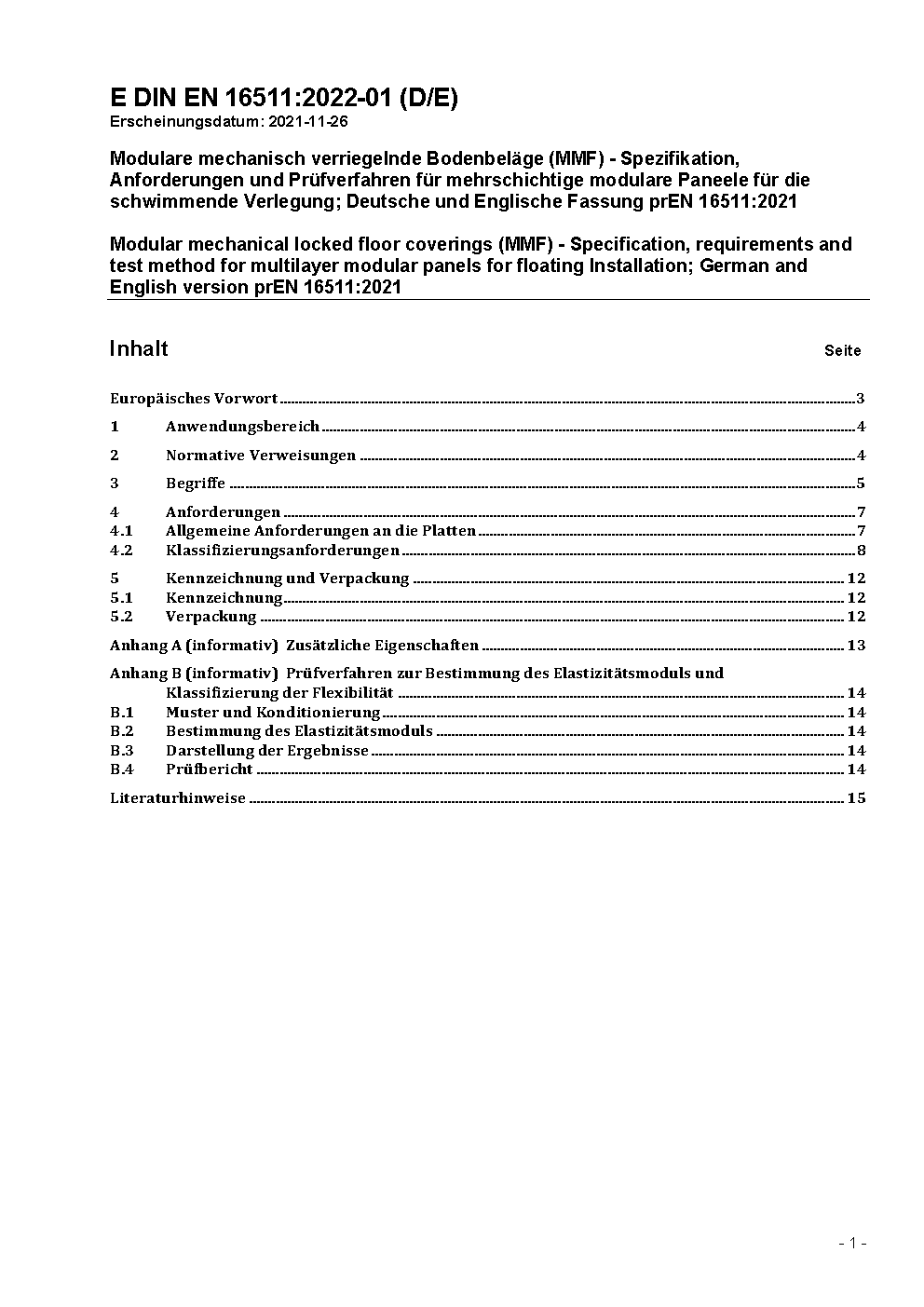 Modulare mechanisch verriegelnde Bodenbeläge (MMF) - Spezifikation, Anforderungen und Prüfverfahren für mehrschichtige modulare Paneele für die schwimmende Verlegung; Deutsche Fassung EN 16511:2023