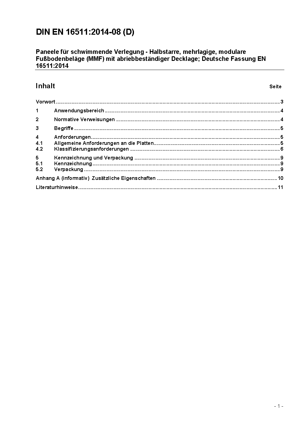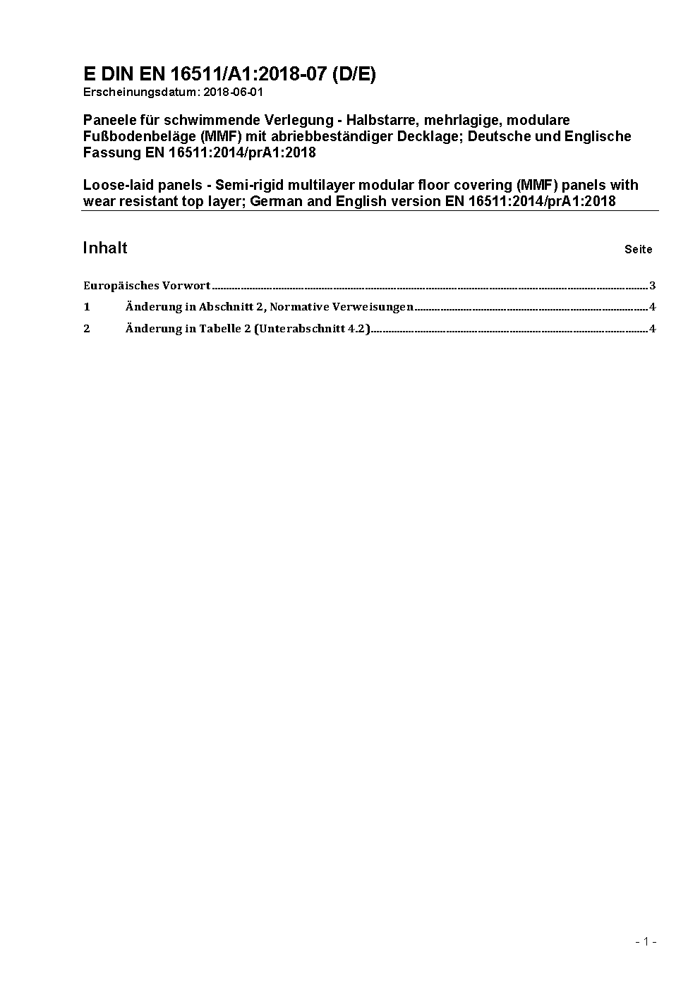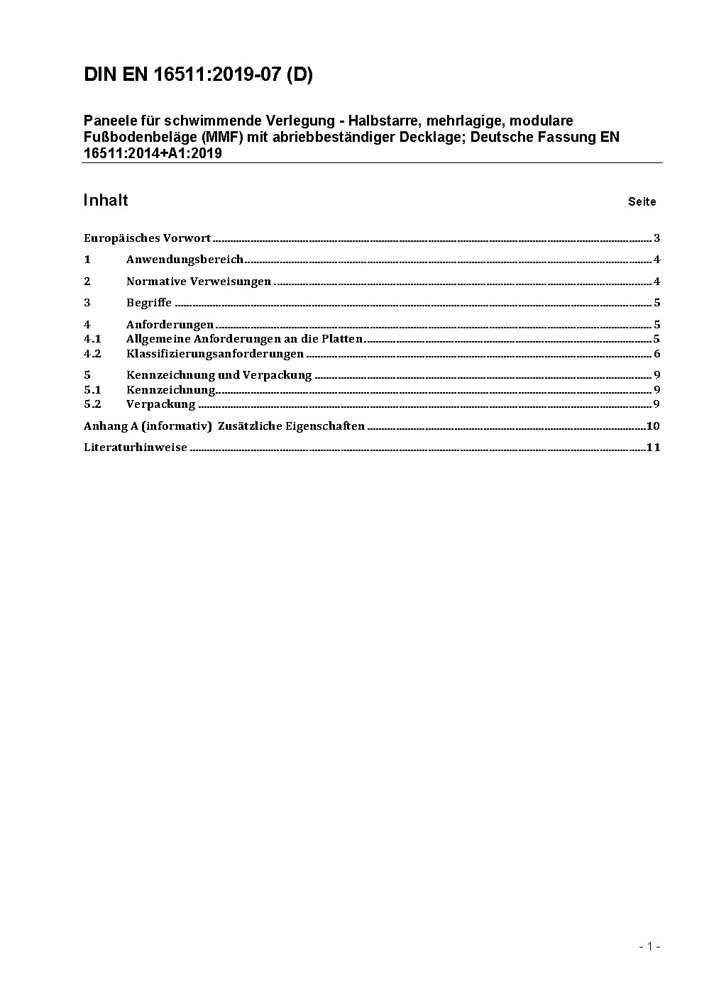 Modulare mechanisch verriegelnde Bodenbeläge (MMF) - Spezifikation, Anforderungen und Prüfverfahren für mehrschichtige modulare Paneele für die schwimmende Verlegung; Deutsche Fassung EN 16511:2023