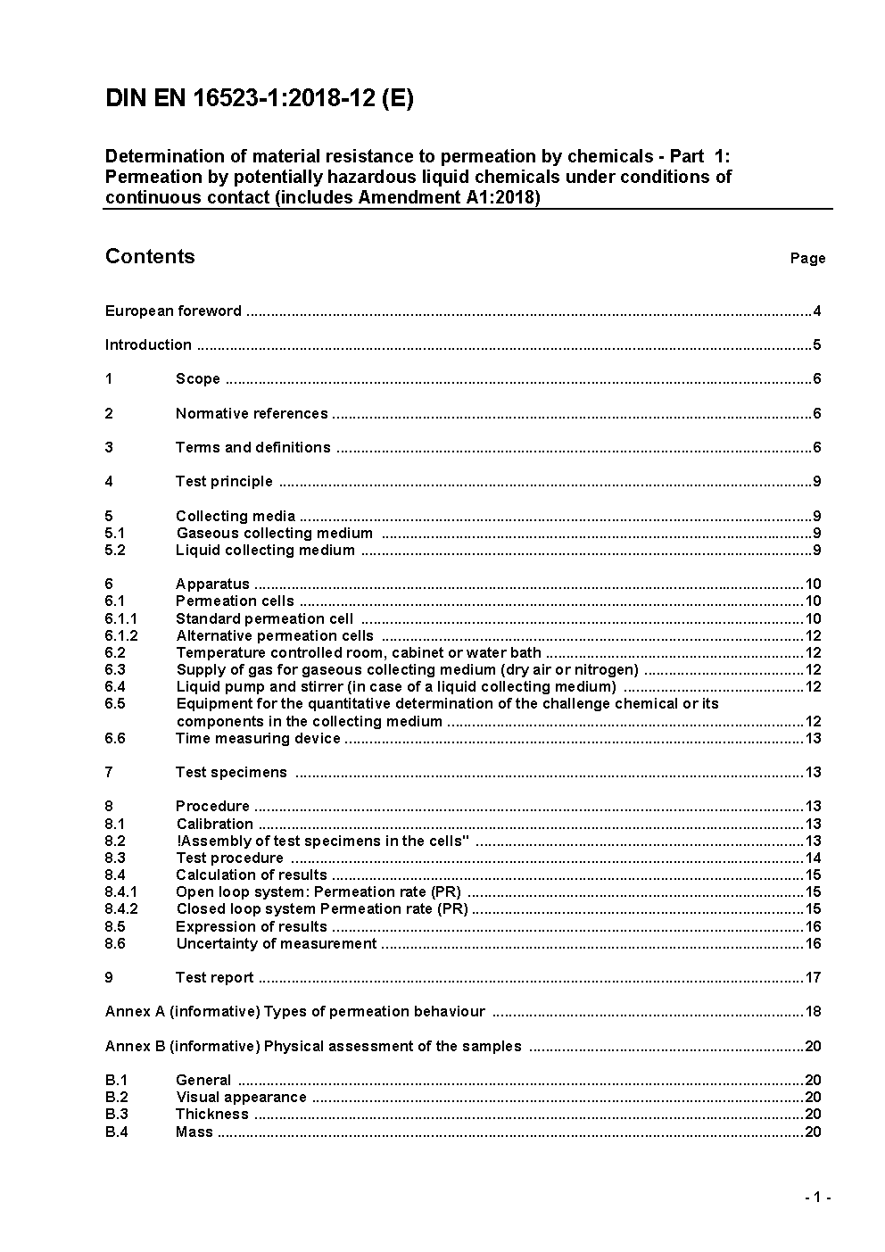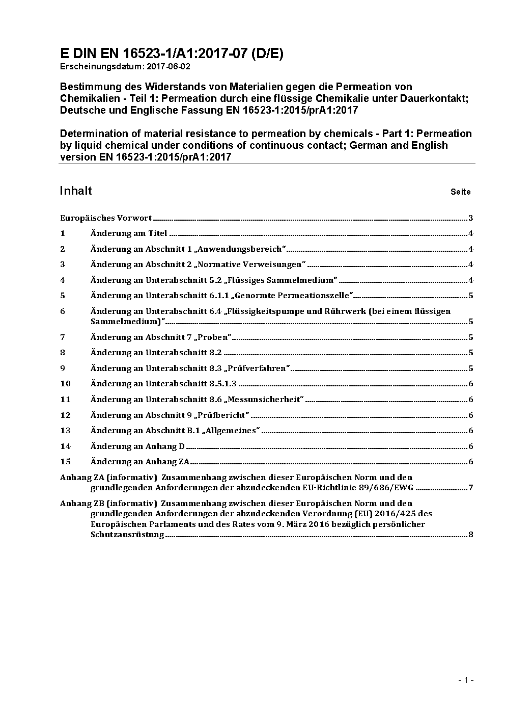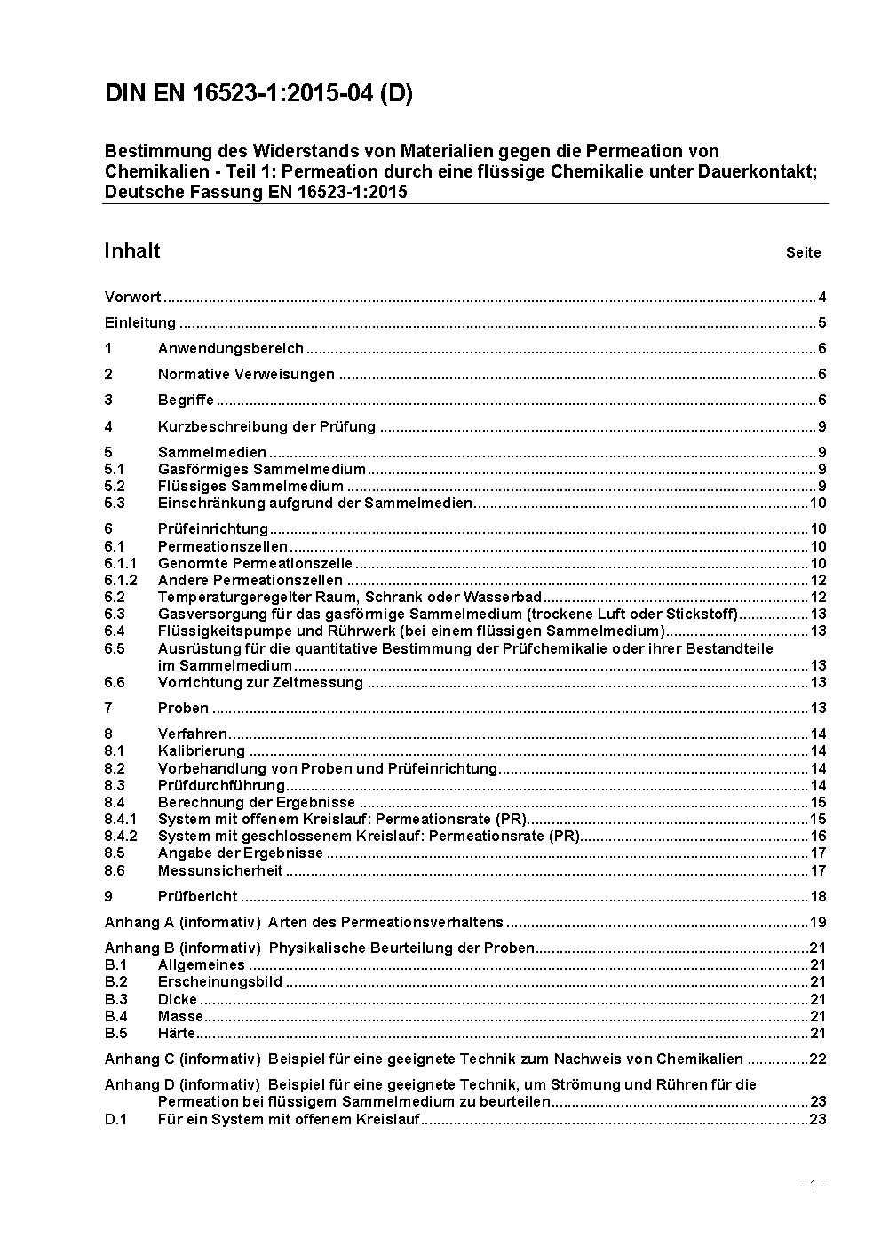 Bestimmung des Widerstands von Materialien gegen die Permeation von Chemikalien - Teil 1: Permeation durch potentiell gefährliche flüssige Chemikalien unter Dauerkontakt; Deutsche Fassung EN 16523-1:2015+A1:2018